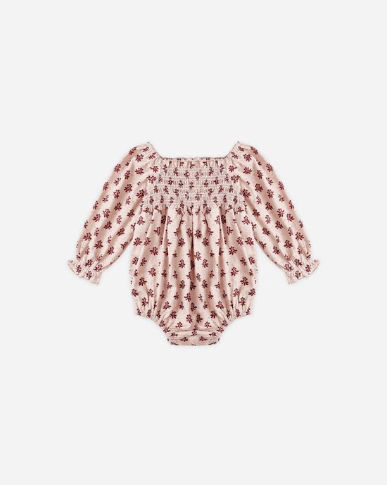 Our Adelaide Romper features a delicate square neckline, smocked detailing at the front and back, long puffed sleeves, and convenient bottom snaps for easy changes.