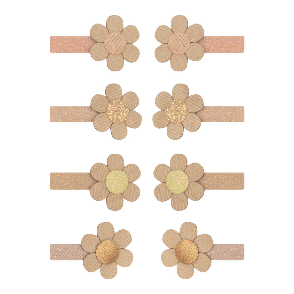 - Sparkling fabric wrapped 3cm alligator clips adorned with sweet fabric daisies with a combination of metallic and glitter centres