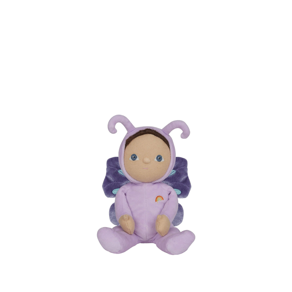 whimsy.With her shimmering velvet wings and soft purple suit, Betty brings a flutter of magic wherever she goes. Little purple antennae peek out from the snug hood, and a tuft of brown hair tells you she’s as sweet as she is spritely. Whether she’s twirling through a make-believe meadow or curled up for a post-flight nap, Betty Butterfly is all about light-hearted fun and fanciful flights of imagination. Part of the limited-edition Backyard Buddies collection, this pocket-sized pal is perfect for tiny hands, big adventures, and everything in between.