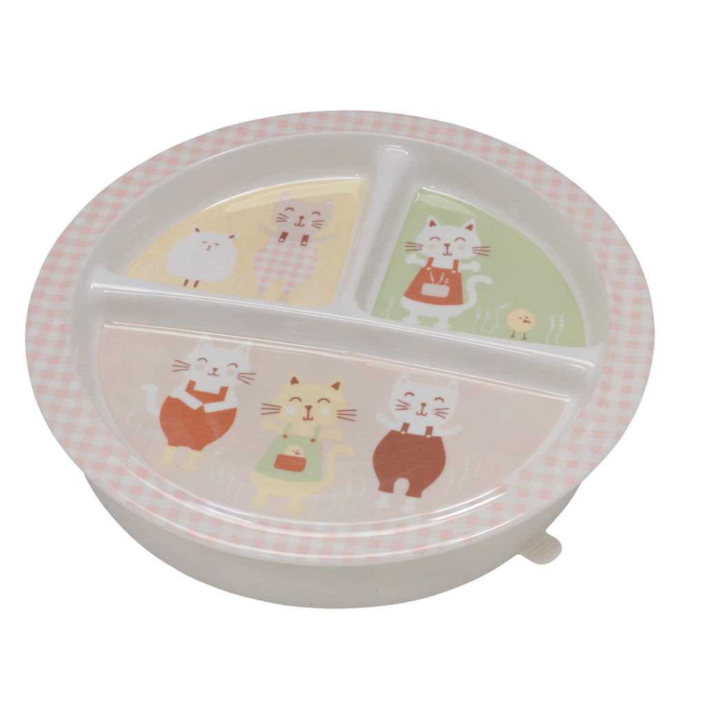 The Prairie Kitty Divided Suction Plate features kind kitties on the prairie with shaggy sheep and curious chicks on a wispy wheat background with a gingham border. The Divided Suction Plate has three divided sections and a removable suction base that is designed to help keep the plate in place on most smooth surfaces.