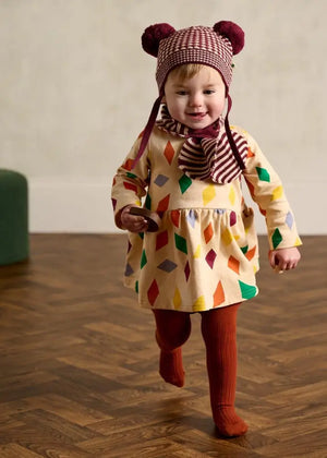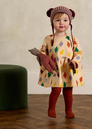 Combine cosy comfort and style with our long-sleeved diamond print baby and kids sweatshirt dress. Made from 100% GOTS certified organic cotton, this soft and breathable dress is gentle on delicate skin. Internally brushed fabric for extra warmth, press studs on baby sizes make dressing easy and the pockets are great for storing their treasures. This eco-friendly baby dress combines sustainability with adorable design. Ideal for everyday wear during the winter.