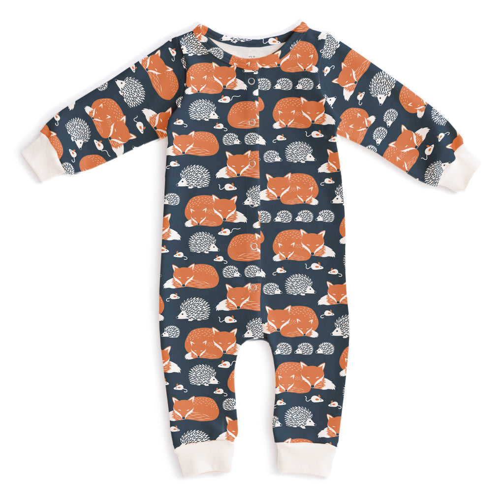 The coziest one-piece outfit, in our Foxes and Hedgehogs print. A cozy forest scene with snuggly foxes, a hedgehog family and a little mouse or two.