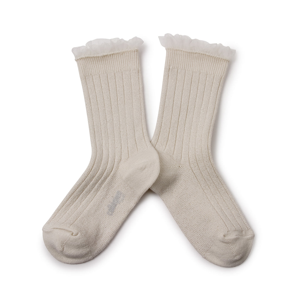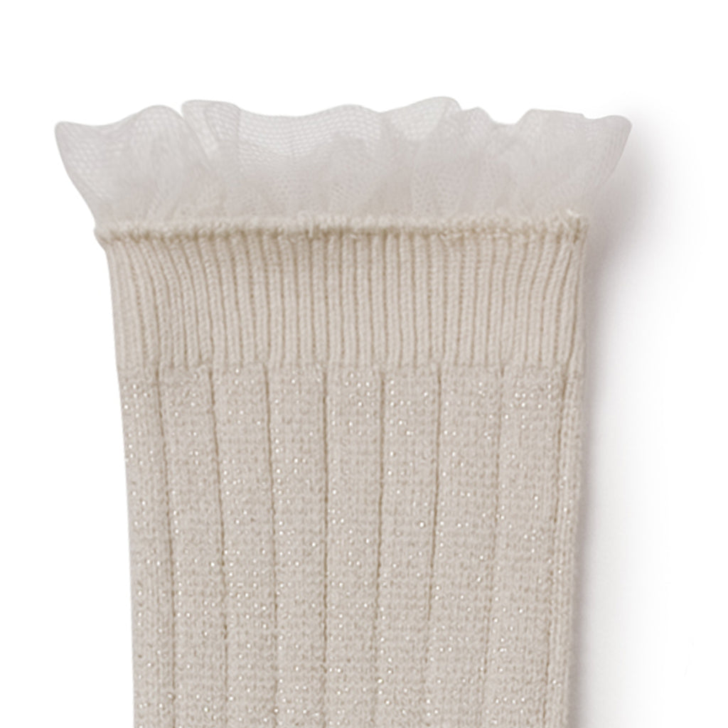 Glitter Ribbed Crew Socks with Tulle Trim (Off White)