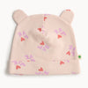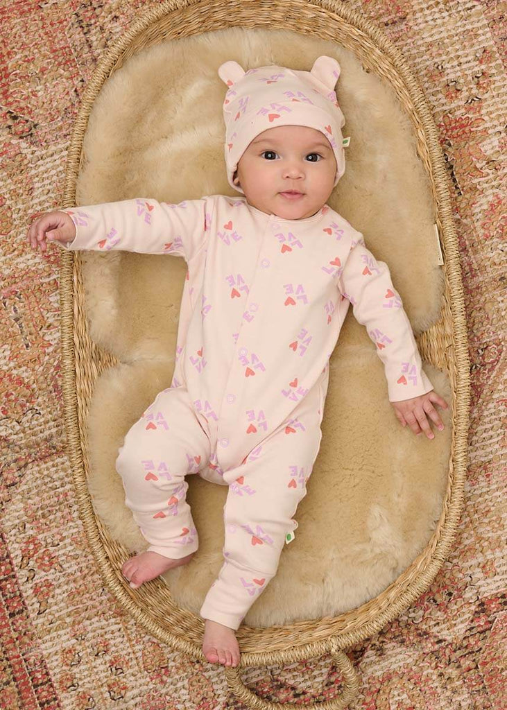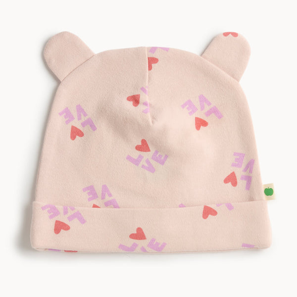 The all-over LOVE print in soft red and lilac adds playful charm to the soft pink base, while the 3D bear-style ears bring a touch of fun. Inside, the brushed organic interlock cotton feels extra soft against sensitive infant skin. A fold-over ribbed hem offers a snug and adjustable fit that stays in place.