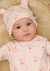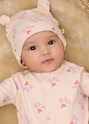 The all-over LOVE print in soft red and lilac adds playful charm to the soft pink base, while the 3D bear-style ears bring a touch of fun. Inside, the brushed organic interlock cotton feels extra soft against sensitive infant skin. A fold-over ribbed hem offers a snug and adjustable fit that stays in place.