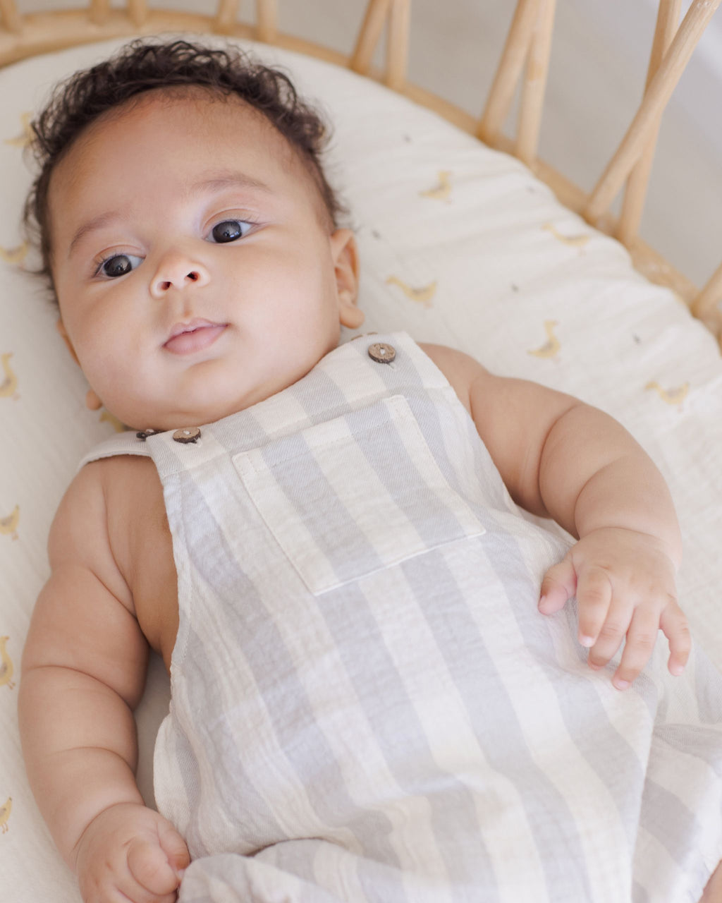 Woven overall romper featuring buttoned straps, an open bib pocket, and elastic leg openings.Featuring our ‘sky stripe’ print - a classic stripe for warm weather.Care: Machine wash cold. Hang to dry.Made of 100% organic cotton.
