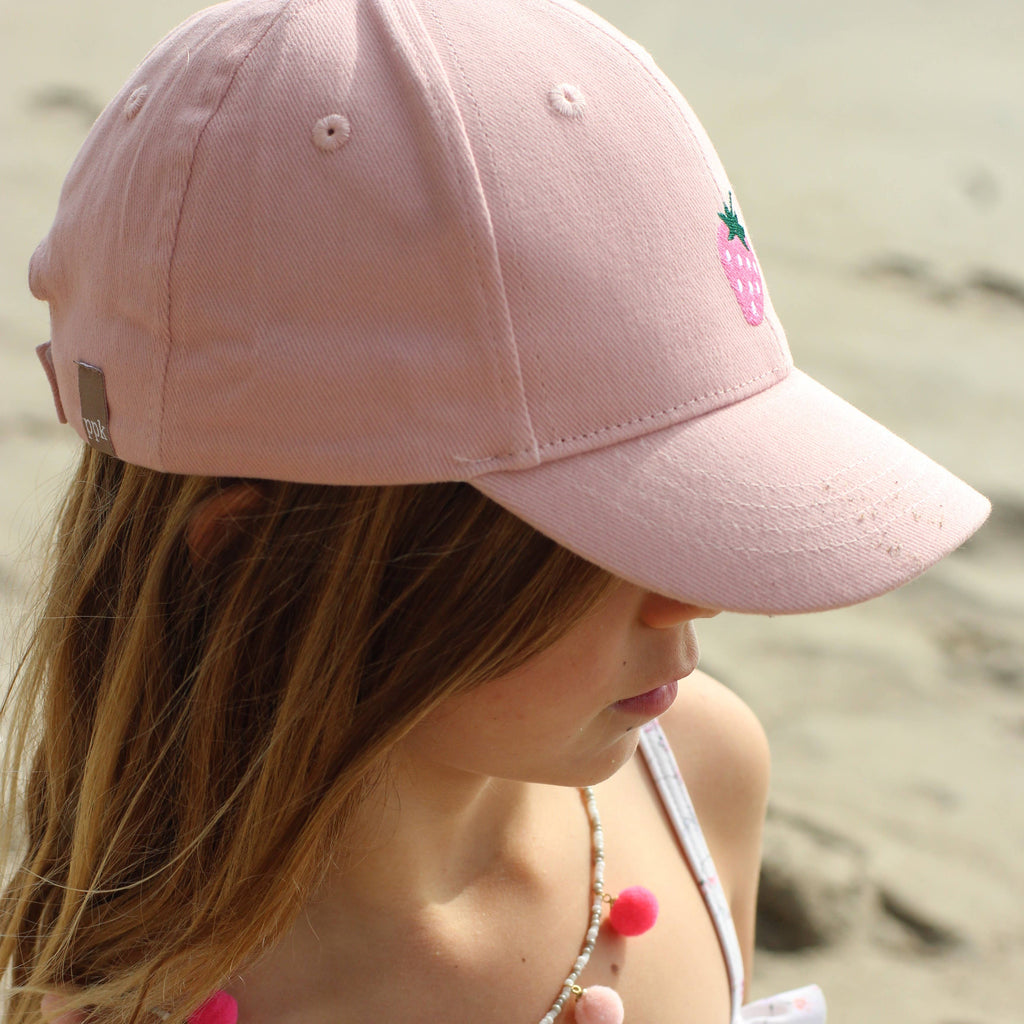 In soft, brushed vintage-colored cotton, our delicious, sweet strawberries adorned baseball caps are versatile and joy for little girls to wear. 100 % cotton