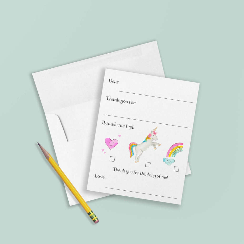 Introduce a fun and interactive way for children to express gratitude with these original watercolor illustrated kids’ stationery thank you cards. Each card allows little ones to practice writing skills by filling in the recipient’s name, the gift they received, & signing their own name at the bottom. The exciting twist is a heart, unicorn and rainbow, each representing a different happy emotion that they can check off!