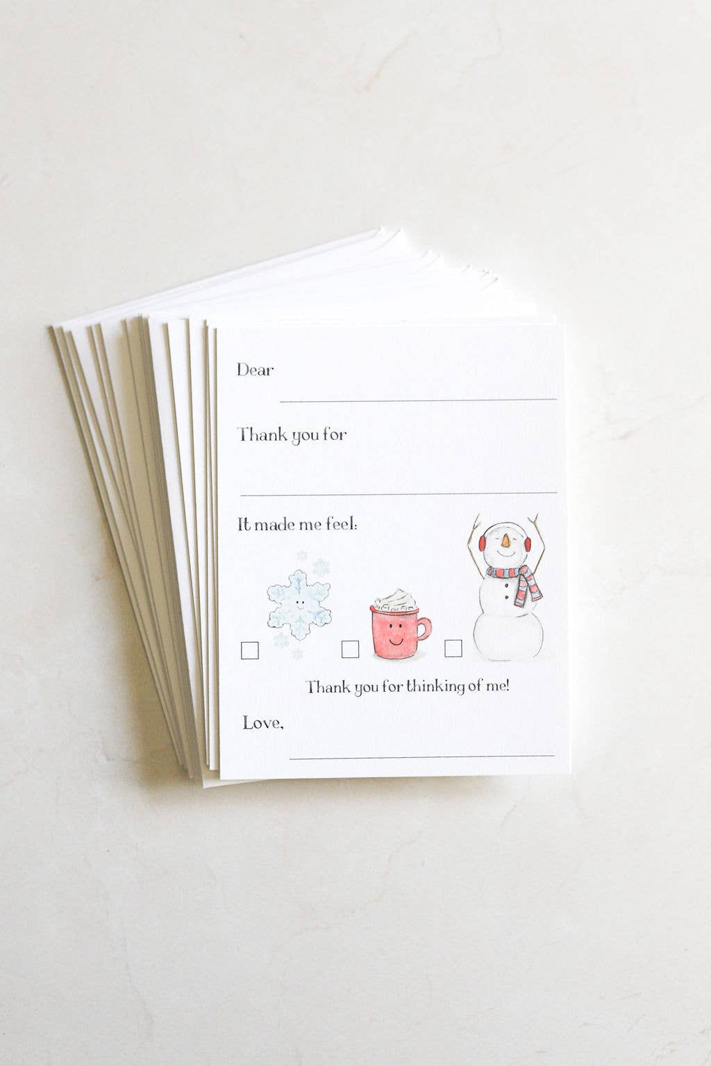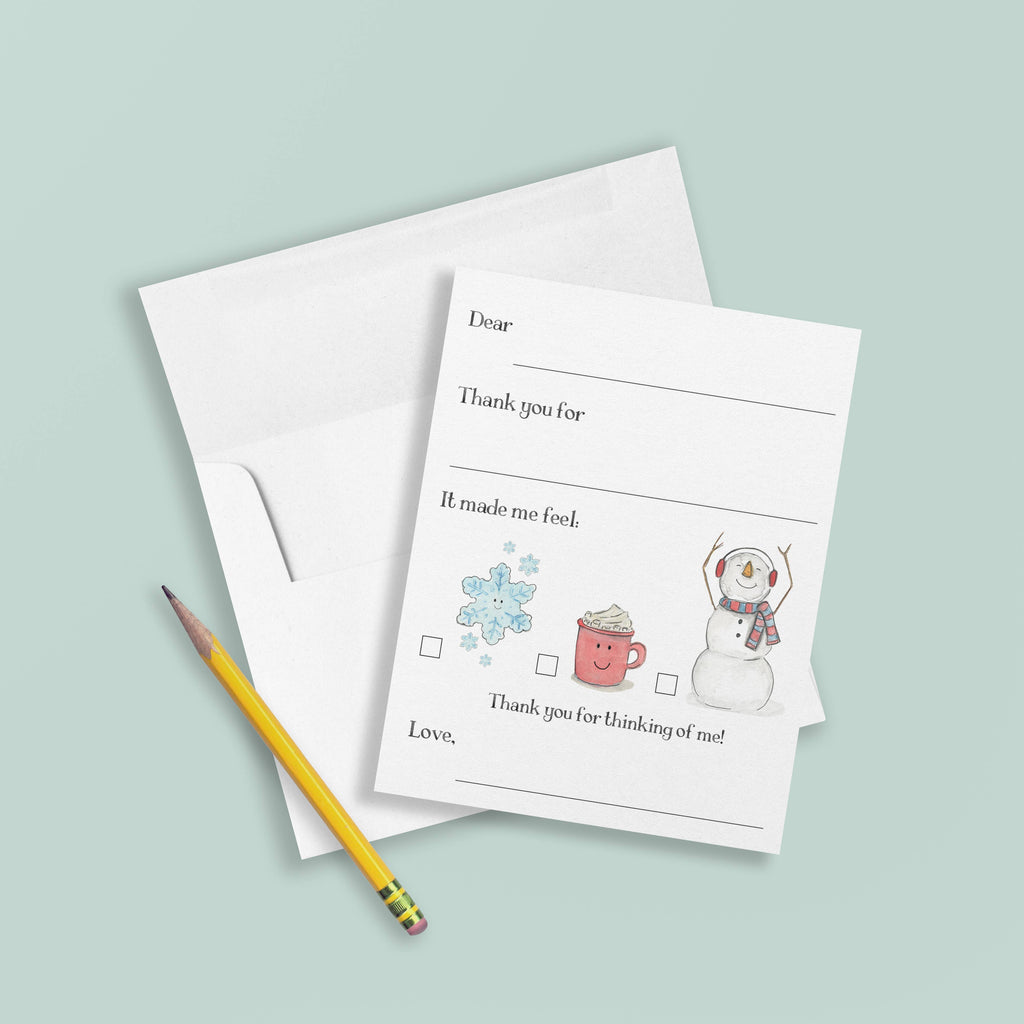 Introduce a fun and interactive way for children to express gratitude with these original watercolor illustrated kids’ stationery thank you cards. Each card allows little ones to practice writing skills by filling in the recipient’s name, the gift they received, & signing their own name at the bottom. The exciting twist is a set of three watercolor winter characters, each representing a different happy emotion they can check off!