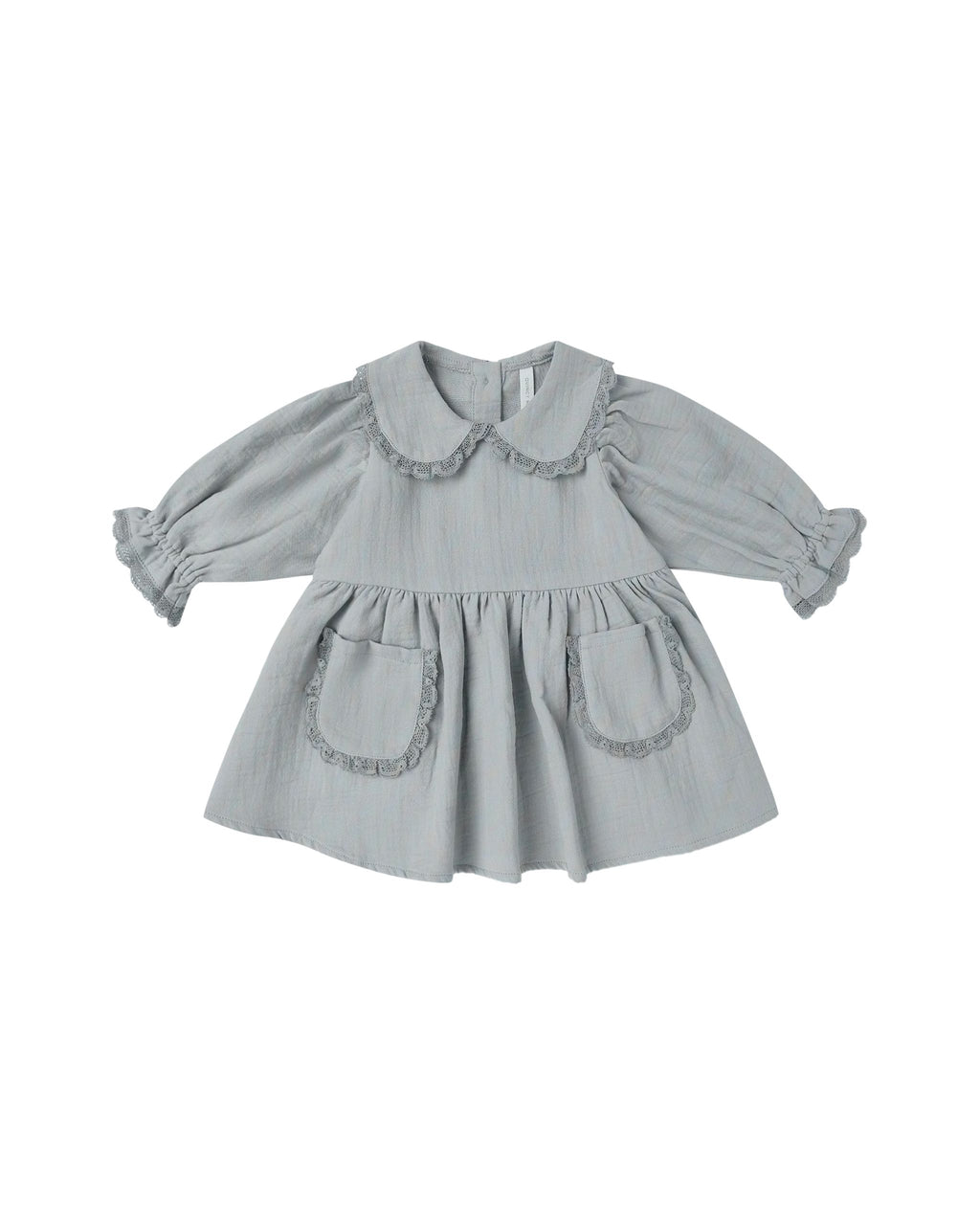 Our Marisol Dress features a Peter Pan collar, patch pockets, and full gathered sleeves—all adorned with delicate lace ruffle trim—and coconut buttons at the back for easy dressing. Coordinating bloomers included with all sizes.