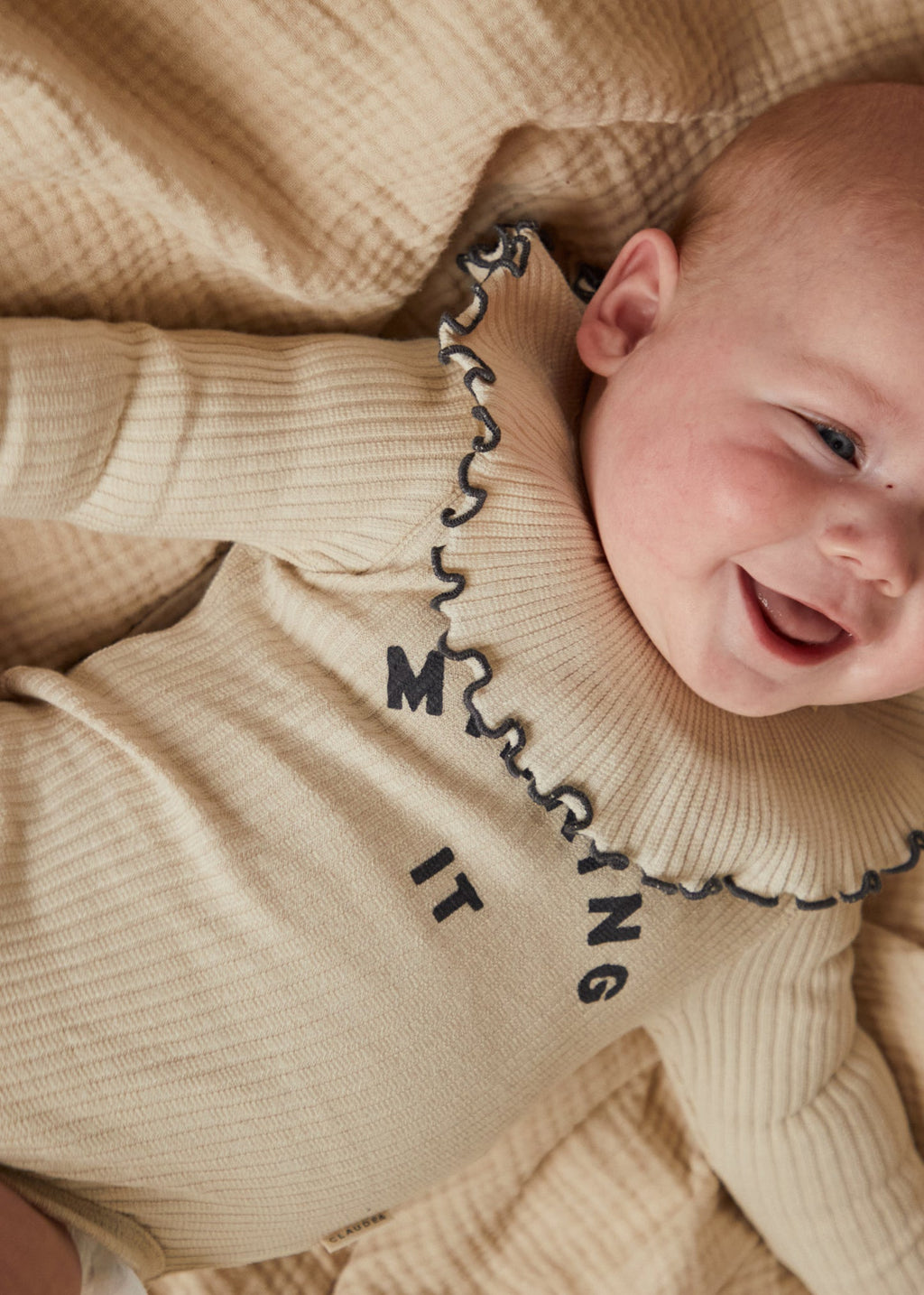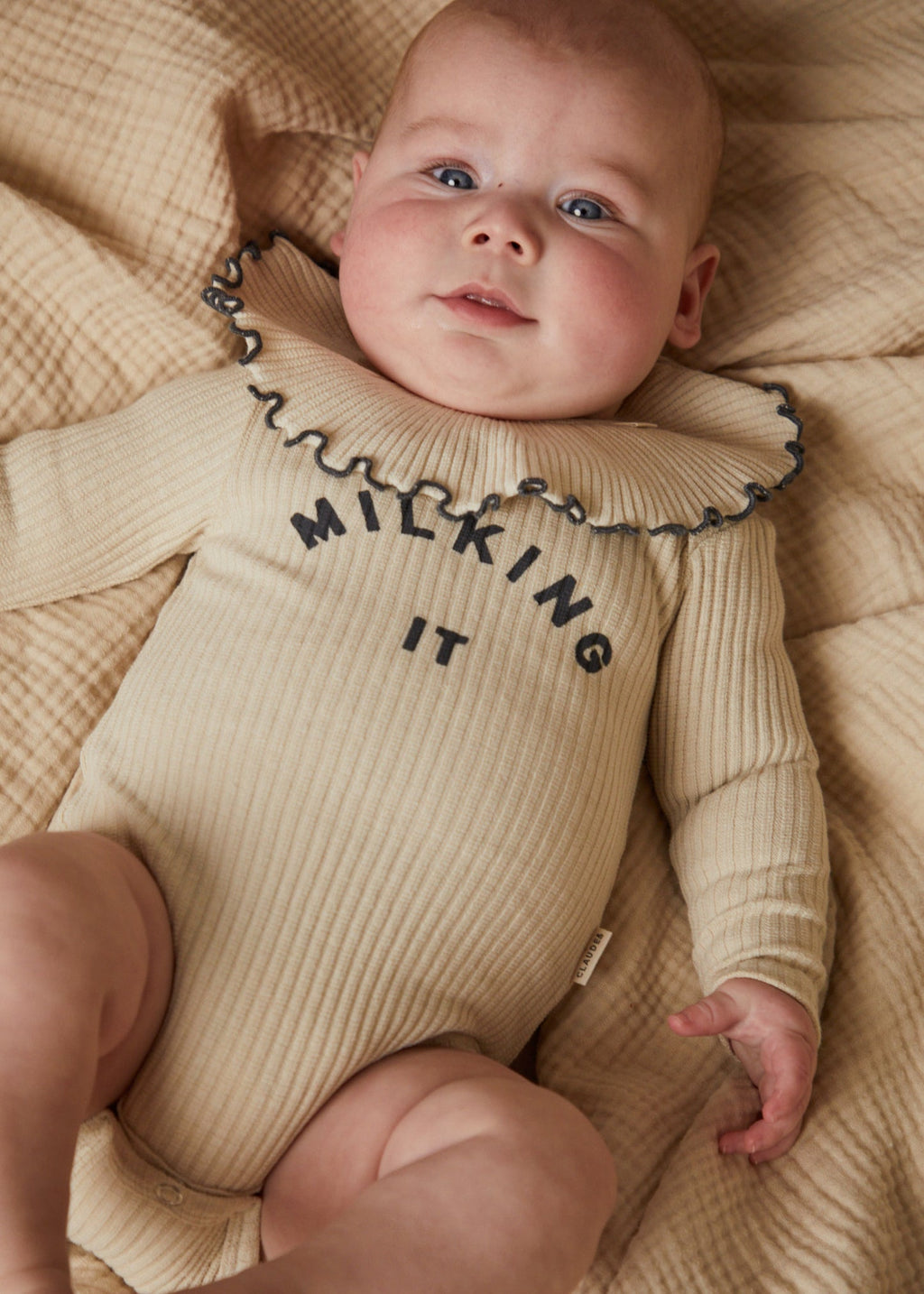 Our iconic oat, now in a body silhouette for everyday layering. Organic rib with gentle stretch, finished with a charcoal Milking It print. Envelope neck and poppers at the crotch for quick changes. True to size. 97% organic cotton, 3% elastane. Made in Portugal. Unisex. Pair with the matching Milking It collar and more Milking It favourites.