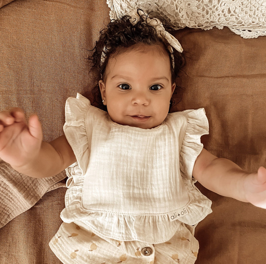 This gorgeous ruffle bib is made from 100% muslin cotton and is perfect to protect your little one's outfits. It features a nickel-free snap closure in the back and two tie closures at each side that keeps your baby's bib snug.