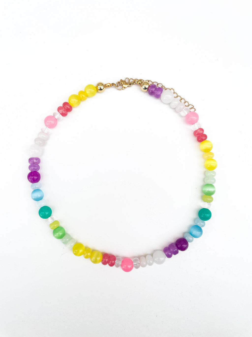 This adorable rock candy necklace features a vibrant mix of gemstone beads. Each necklace features small, round, and oval-shaped beads in various vibrant and pastel colors. The gemstones range from translucent to opaque and come in shades of pink, blue, green, purple, orange, yellow, and white. Perfect for adding a touch of color and charm to any outfit! 16" necklace with 3" extension.