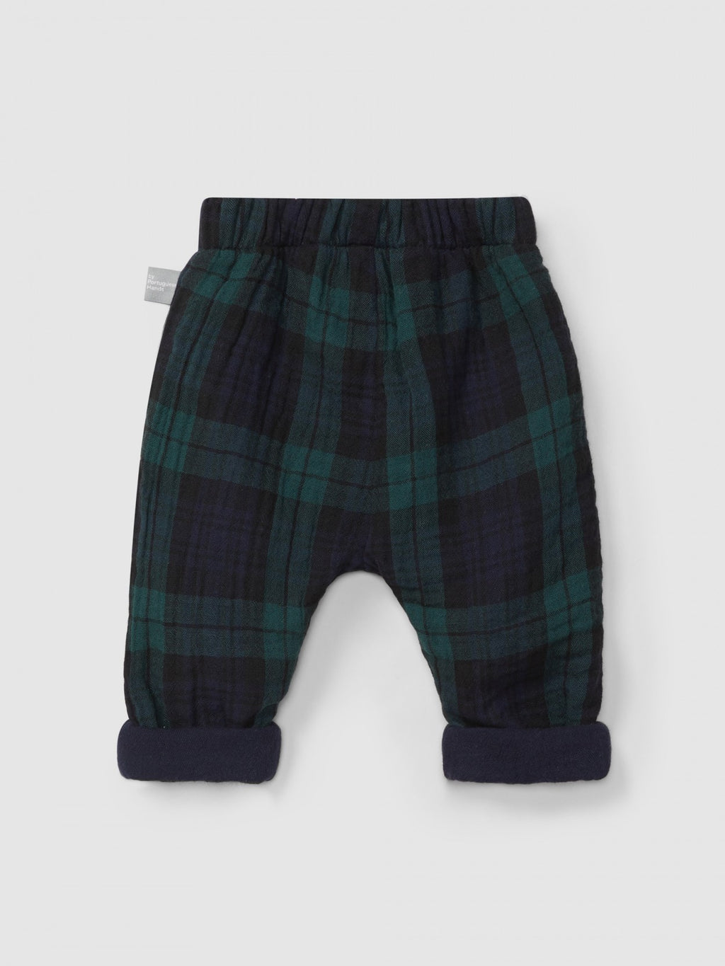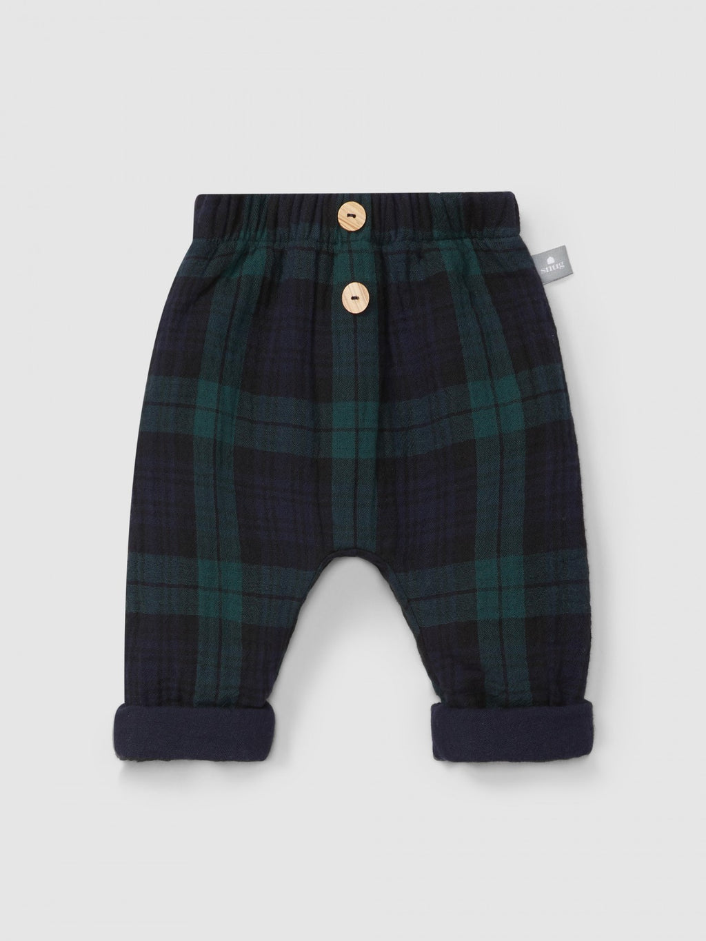 Pull-up pants in 100% organic cotton triple gauze. Decorative wooden buttons. Cuff can be used rolled up or rolled down for greater durability.