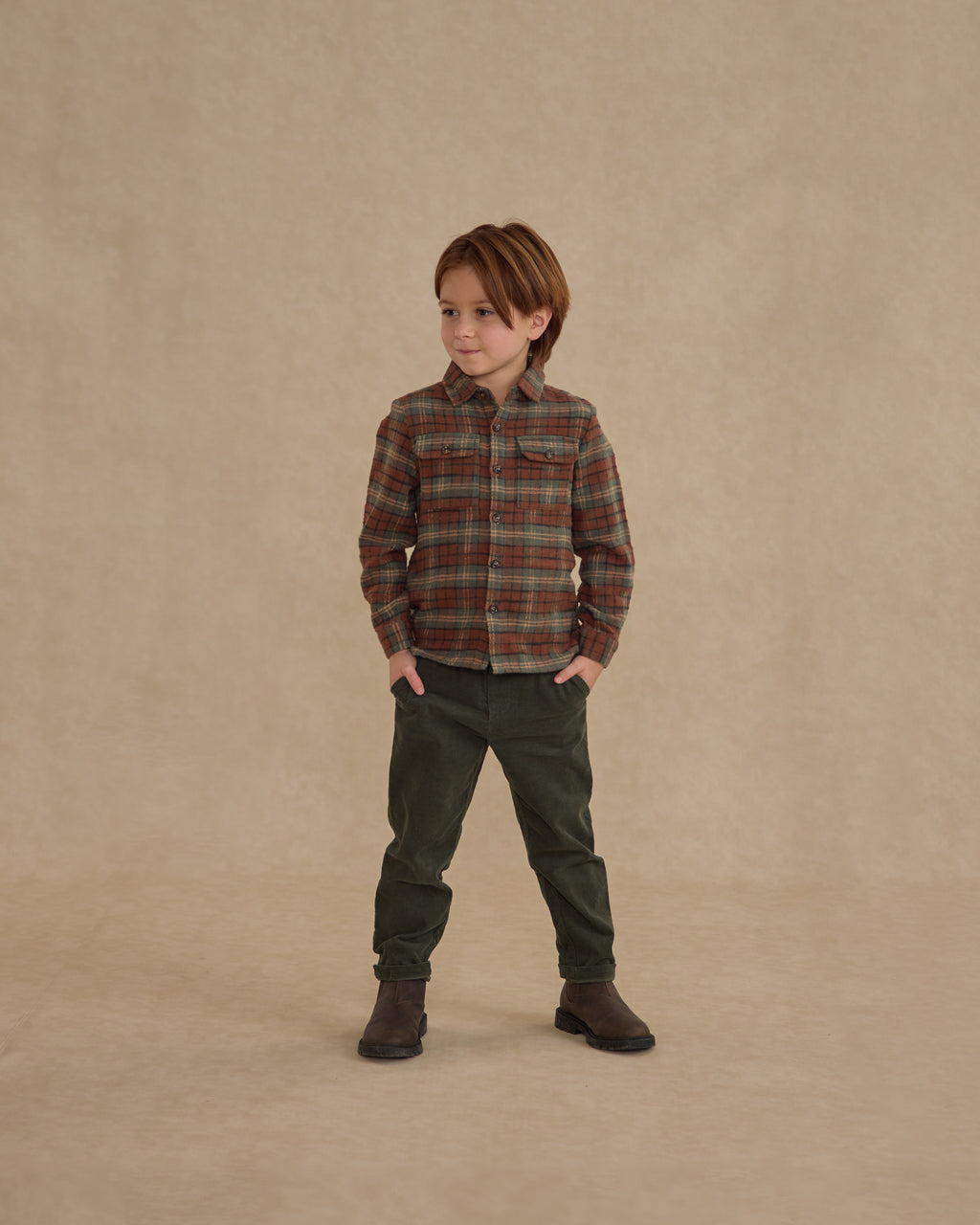 A classic boys long sleeve collared shirt with buttons along the center front and pockets at the front.