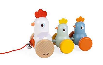Wooden toy for children aged 18 to 36 months. A fantastic early-learning toy that will motivate your child to learn to walk. As you take them for a stroll, mother hen and her chicks all waddle and the little bell tinkles merrily.