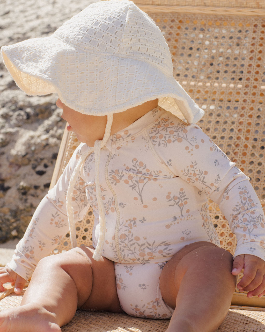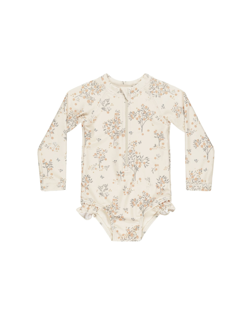 This one-piece rashguard swimsuit will have your little one protected from the sun in style. Featuring a zipper front closure and ruffle detail at the leg openings.