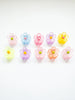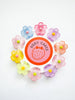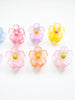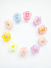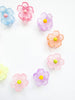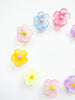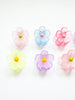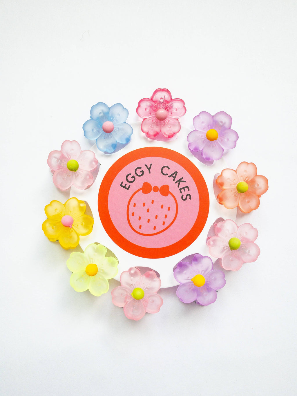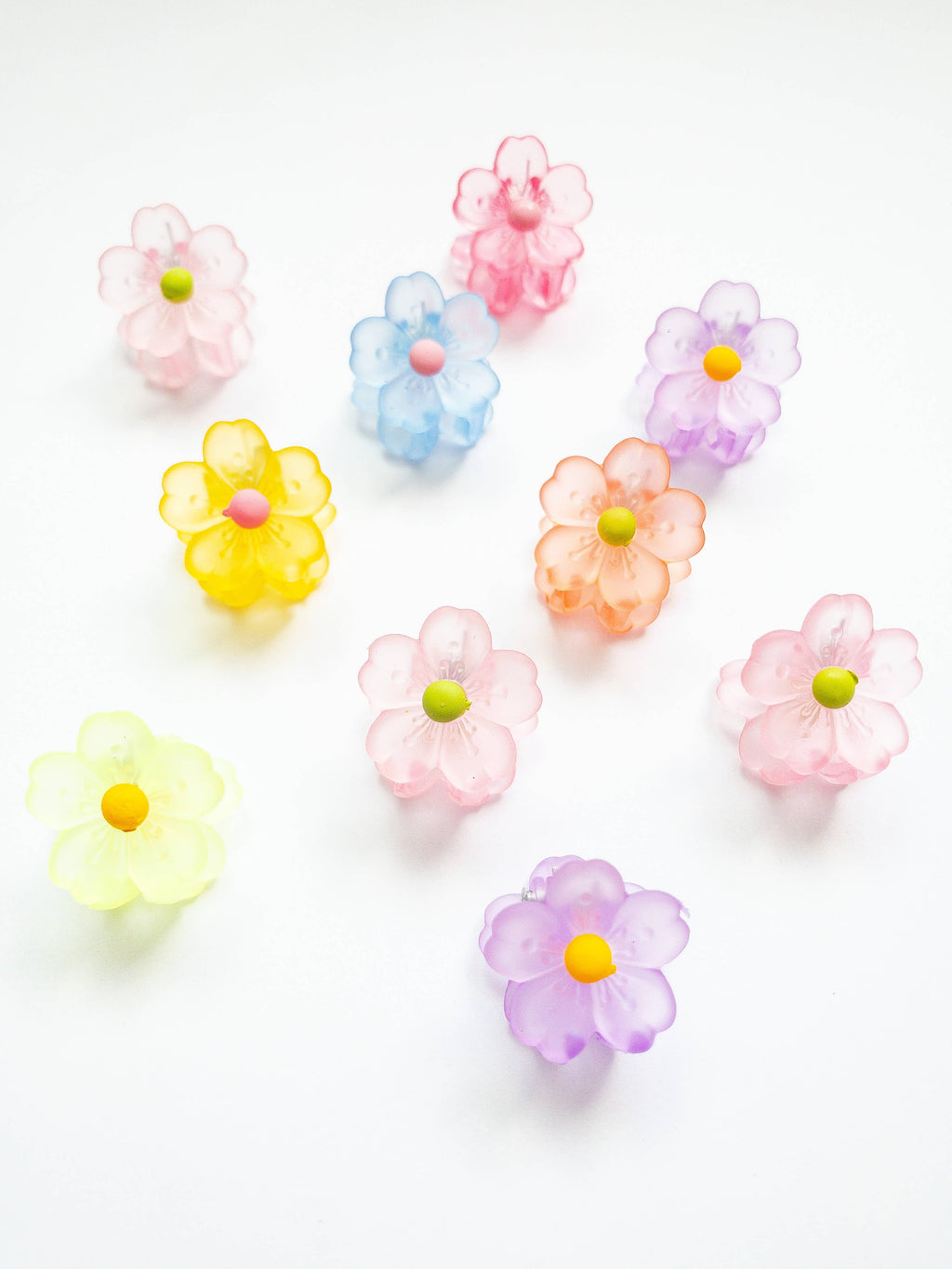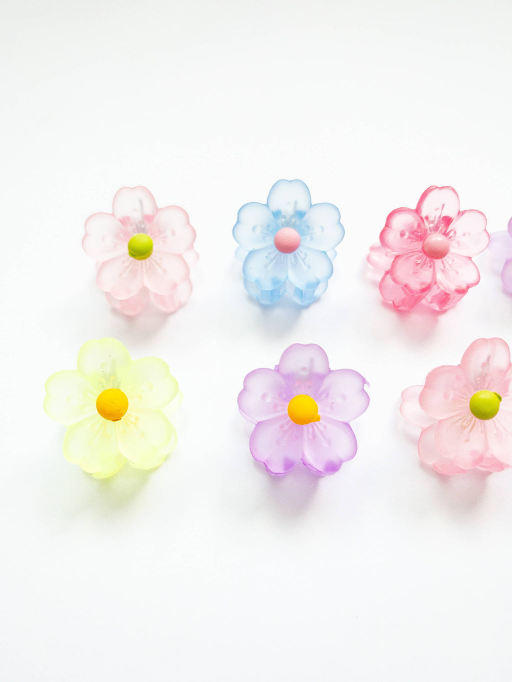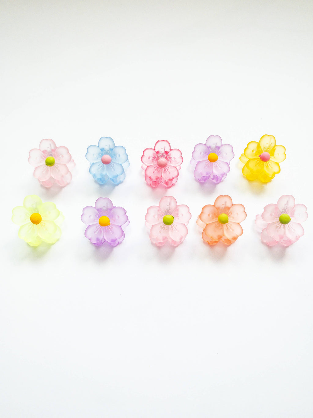 A 10-pack assortment of gorgeous little sakura cherry blossom flower hair claws. These are not mini sized but a little bigger at .75" in length. They're strong and stay in place and come in a variety of pretty milky jelly colors.