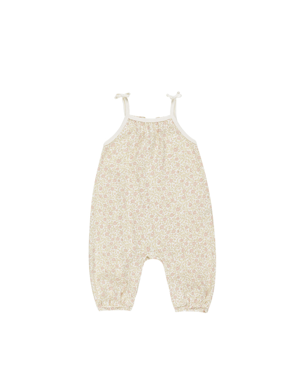 Spaghetti strap jumpsuit with fixed ties, a smocked back. elastic leg openings, and snaps down the inseam for easy changes - a go-to this season for your little one!