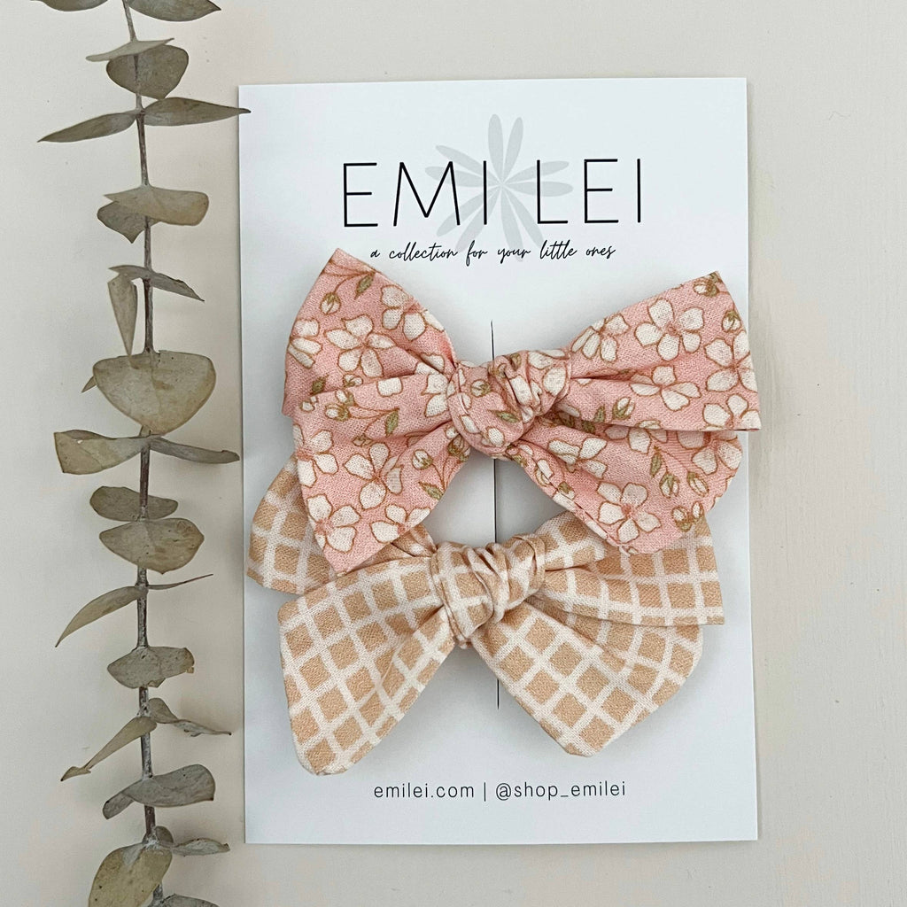 Worked with one of my favorite local artists to curate this one of a kind accessory collection! It has the perfect mix of neutral, earthy toned florals and prints to match any outfit! + Color: Blush Cherry Blooms x Tan Mini Check + Pack of 2 bows with alligator clips + Also available in nylon headbands - see other listing + These bows are handmade so they may vary slightly in size. + Size: Approx 2" x 3"