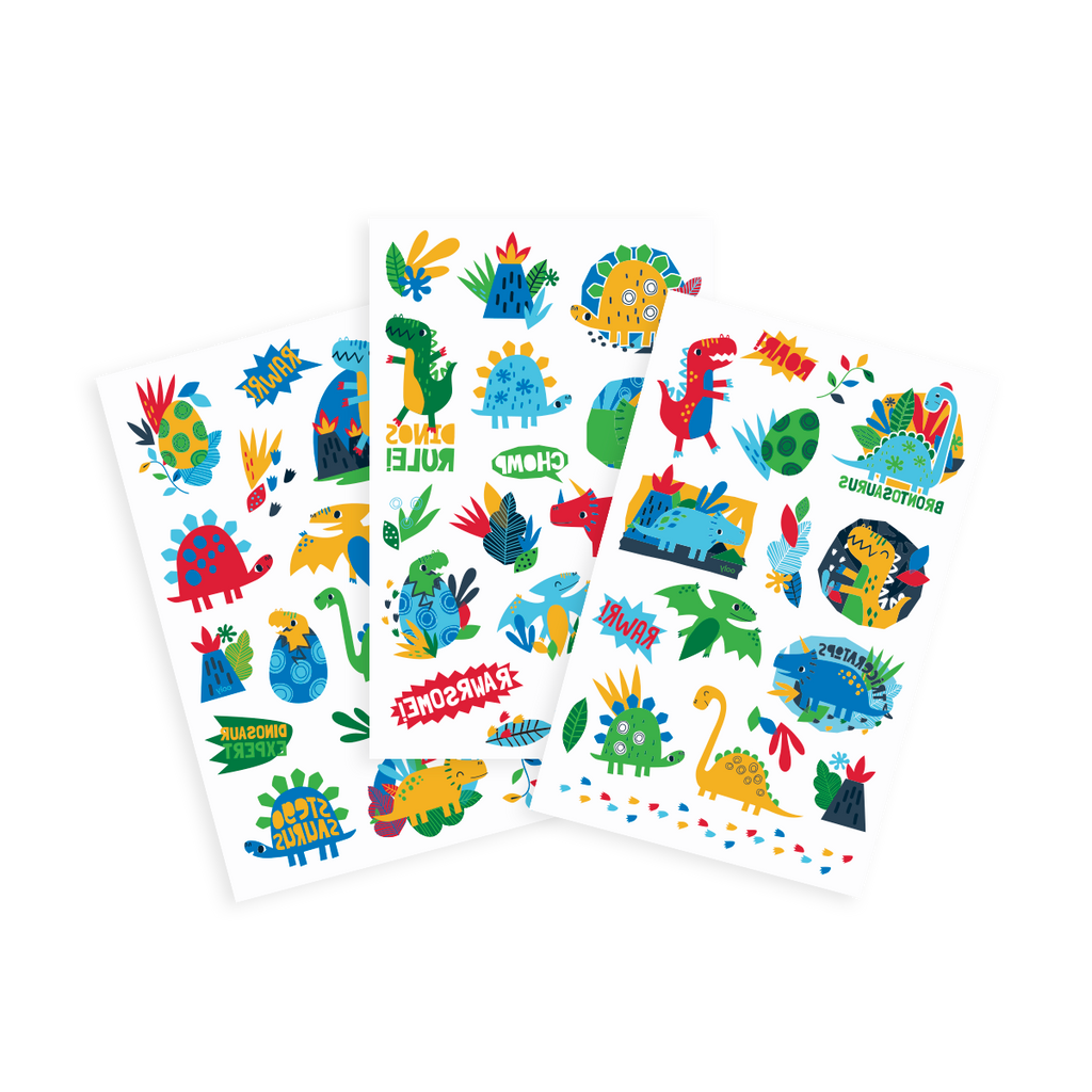 Show off your wild side with this set of fun Dino Days temporary tattoos. Easy to apply and lasts up to 5 days. Non-toxic.