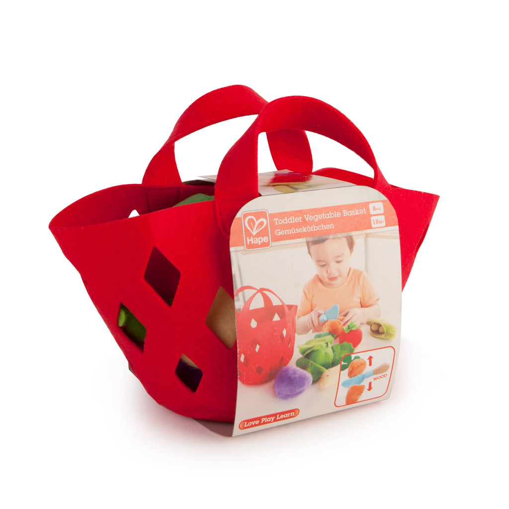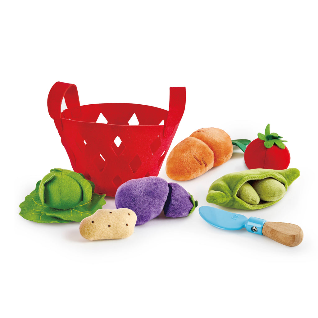 Fill this soft, felt basket with six of your favourite vegetables. Pop the peas from their pod, peel the cabbage leaves and cut the carrot and eggplant in half!. Comes with a knife with a chunky, wooden handle for babies` fingers to grasp and hold.