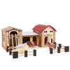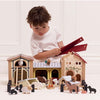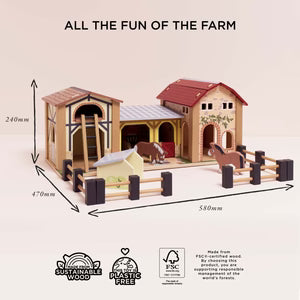 Our wooden farmyard is a true classic! A wonderful toy for encouraging small world play, it's sweet traditional design is sure to appeal to little animal lovers. This playset includes everything you would expect to find on a working farm. Discover the large barn with hay loft, a milking parlour, stable, and there's even a cosy looking pigsty. Mounted on a highly detailed baseboard, decorated with a farmyard scene, complete with movable fences. This sturdy and robust toy is crafted from sustainable wood and makes a lovely addition to your little one's imaginary play collection.