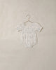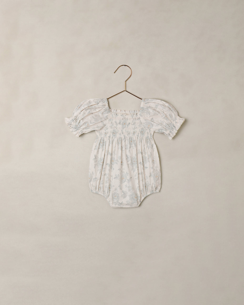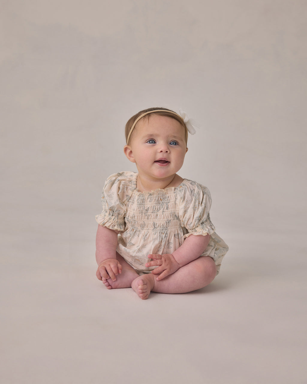 Cute Hazel Romper with smocked neckline and sweet short sleeves.