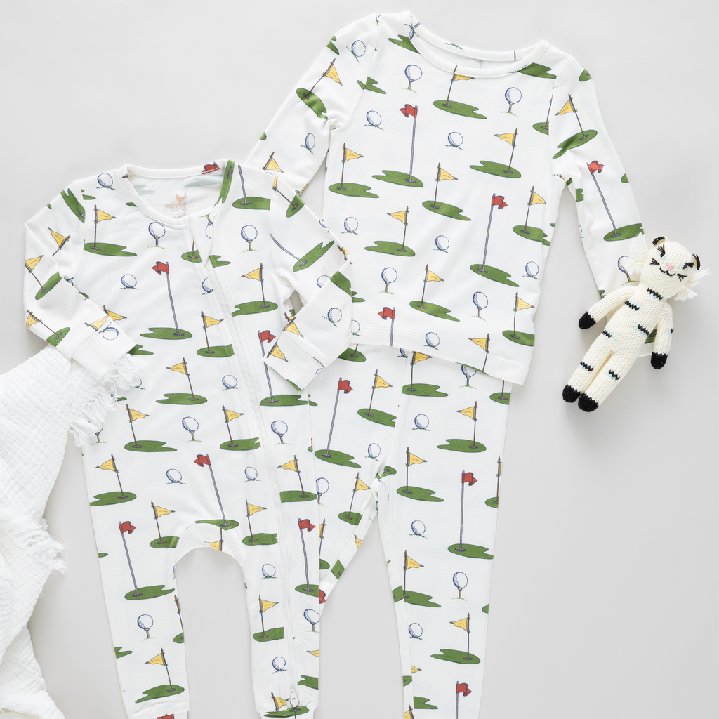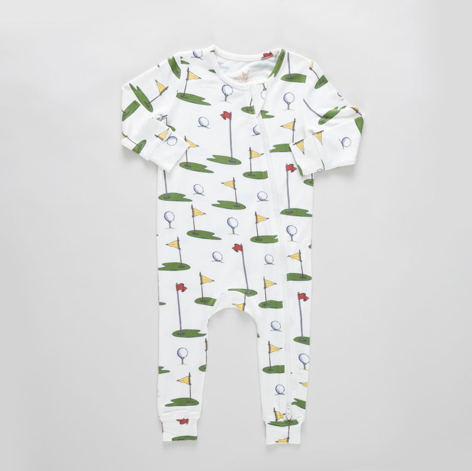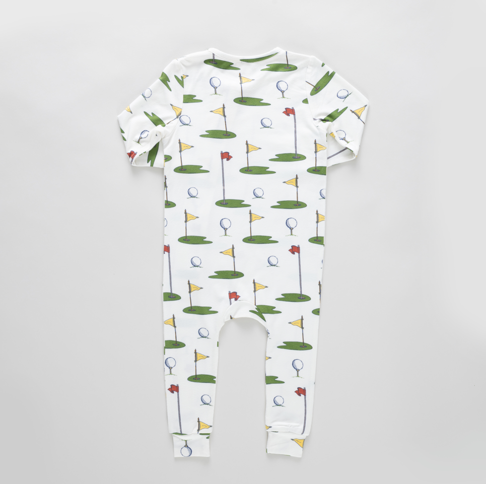 Swing into style with this adorable bamboo romper featuring a charming golf tournament print! Crafted from soft, breathable bamboo fabric, it keeps your little one comfortable all day long. The cream base with playful golf details makes it perfect for playdates, family outings, or cozy days at home. Easy to dress and undress with practical snaps, this romper combines comfort with cuteness—because every baby deserves to look as good as they feel!