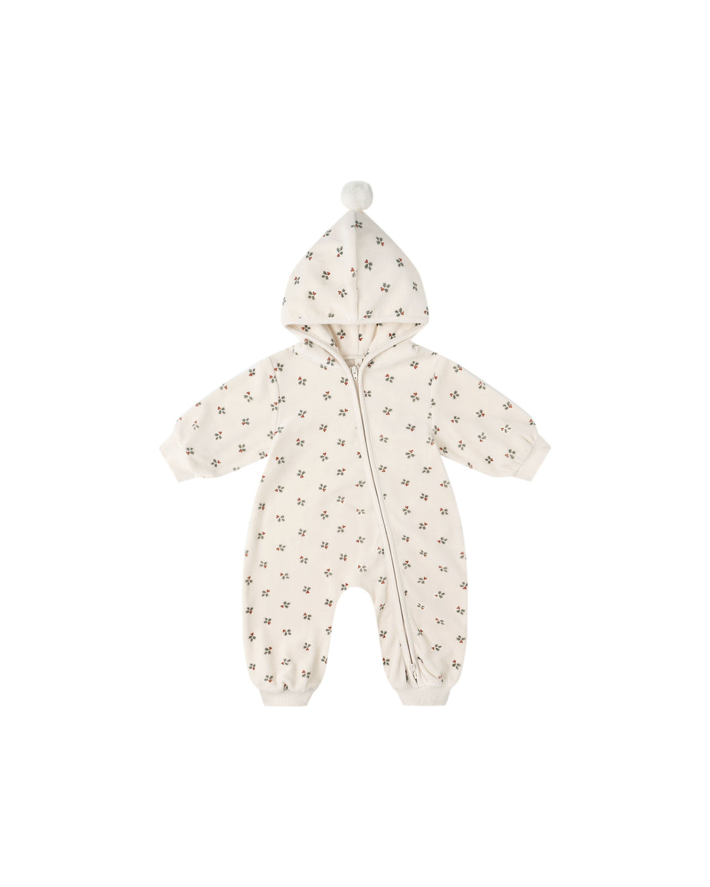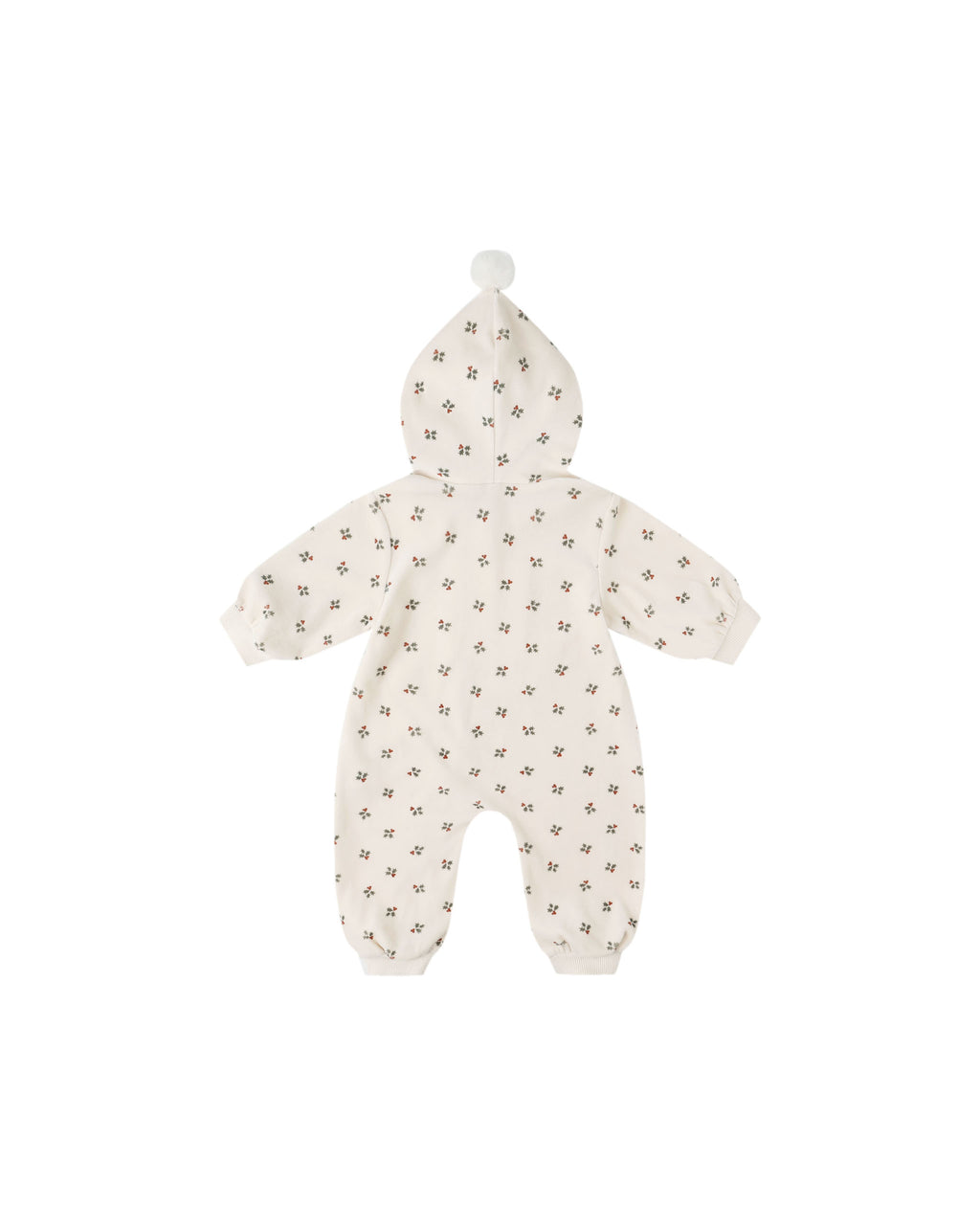 Longsleeve hooded fleece jumpsuit with ribbed sleeve and leg openings, a zipper down the front, and a hoodie with a pom pom on top. Featuring our 'holly berry' all-over print on our 'natural' hue.