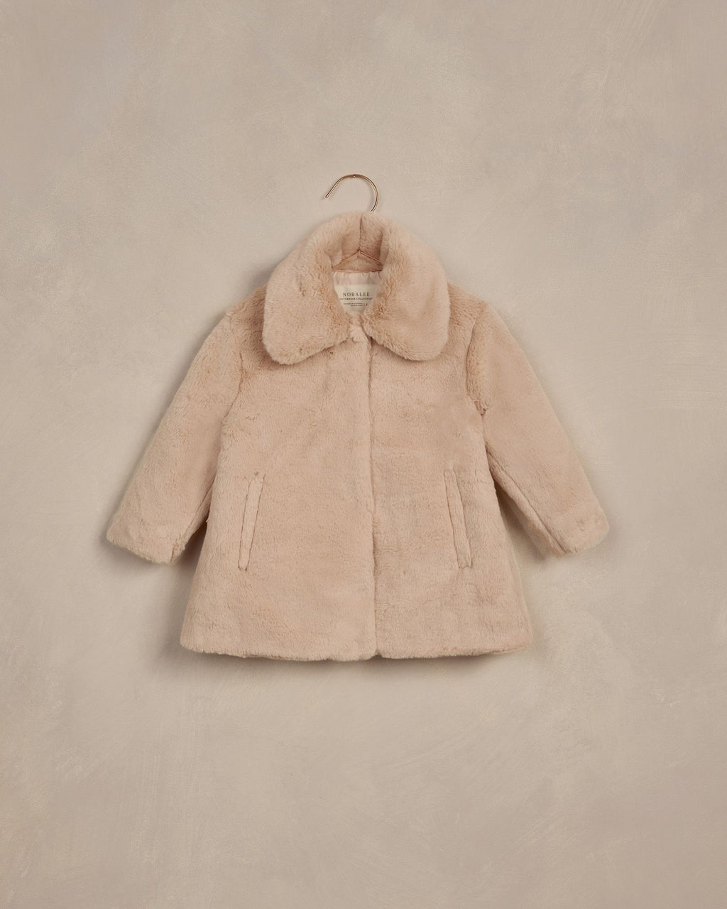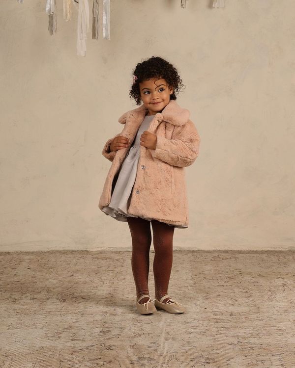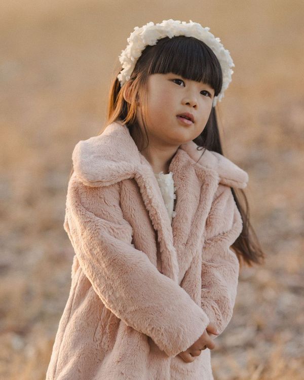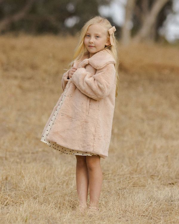 Our new Eloise Coat has hidden snaps along the center front and pockets at the front. With a darling full collar, this slight oversized cut fuax fur coat will keep your little one warm this season.