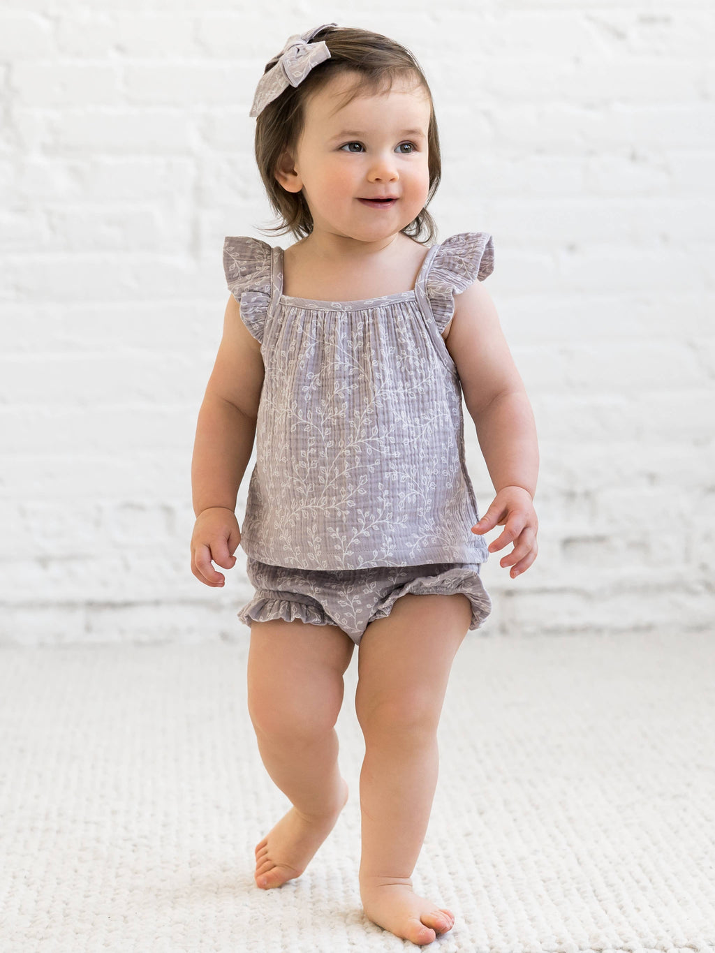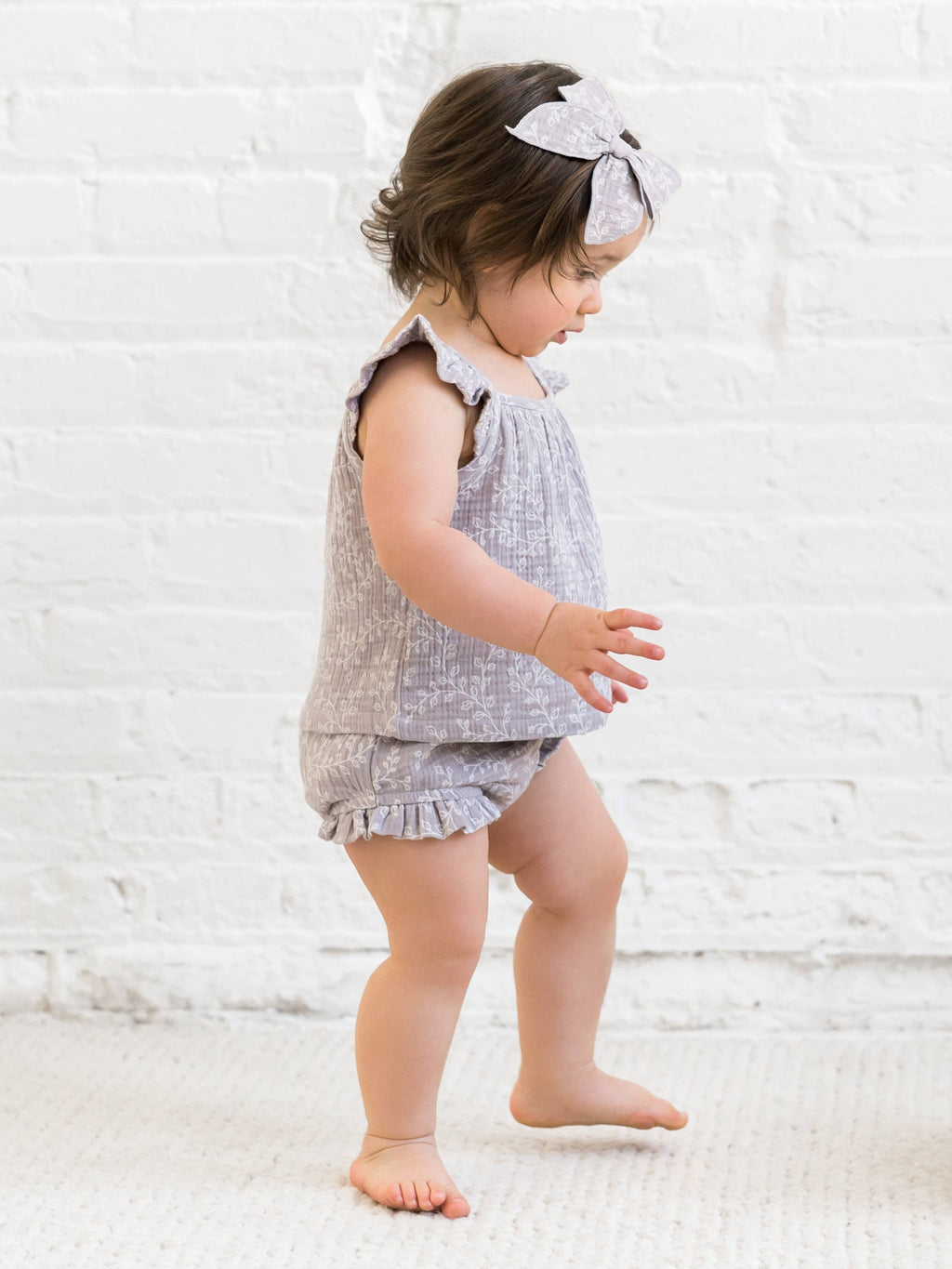 The Suki Muslin Tank and Bloomer Set is the perfect combination of sweet and practical for your little one’s warm-weather adventures. This adorable set features flutter ruffle straps and delicate gathering along the neckline for added charm. The matching bloomers offer extra comfort with an elastic waist and leg openings, while the flutter ruffle at the leg opening adds a playful touch. Whether it’s for picnics, playdates, or everyday fun, this set ensures your little one stays stylish and comfy all day long. Made of 100% Organic Soft-washed Cotton Muslin Water-based dyes ensuring long-lasting color vibrancy and durability Sustainably sourced and ethically produced Naturally hypoallergenic Machine Wash Cold, Tumble Dry Low *Flutter ruffle strap tank *CB button and elastic loop closure *Gathering along front and back neckline *Bloomer with elastic waist and leg opening *Flutter ruffle along leg opening *100% Organic Cotton