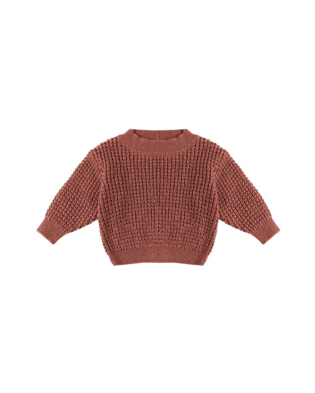 Adorable chunky knit sweater with ribbing at the sleeve and neck openings. Featuring our ‘cranberry’ colorway.