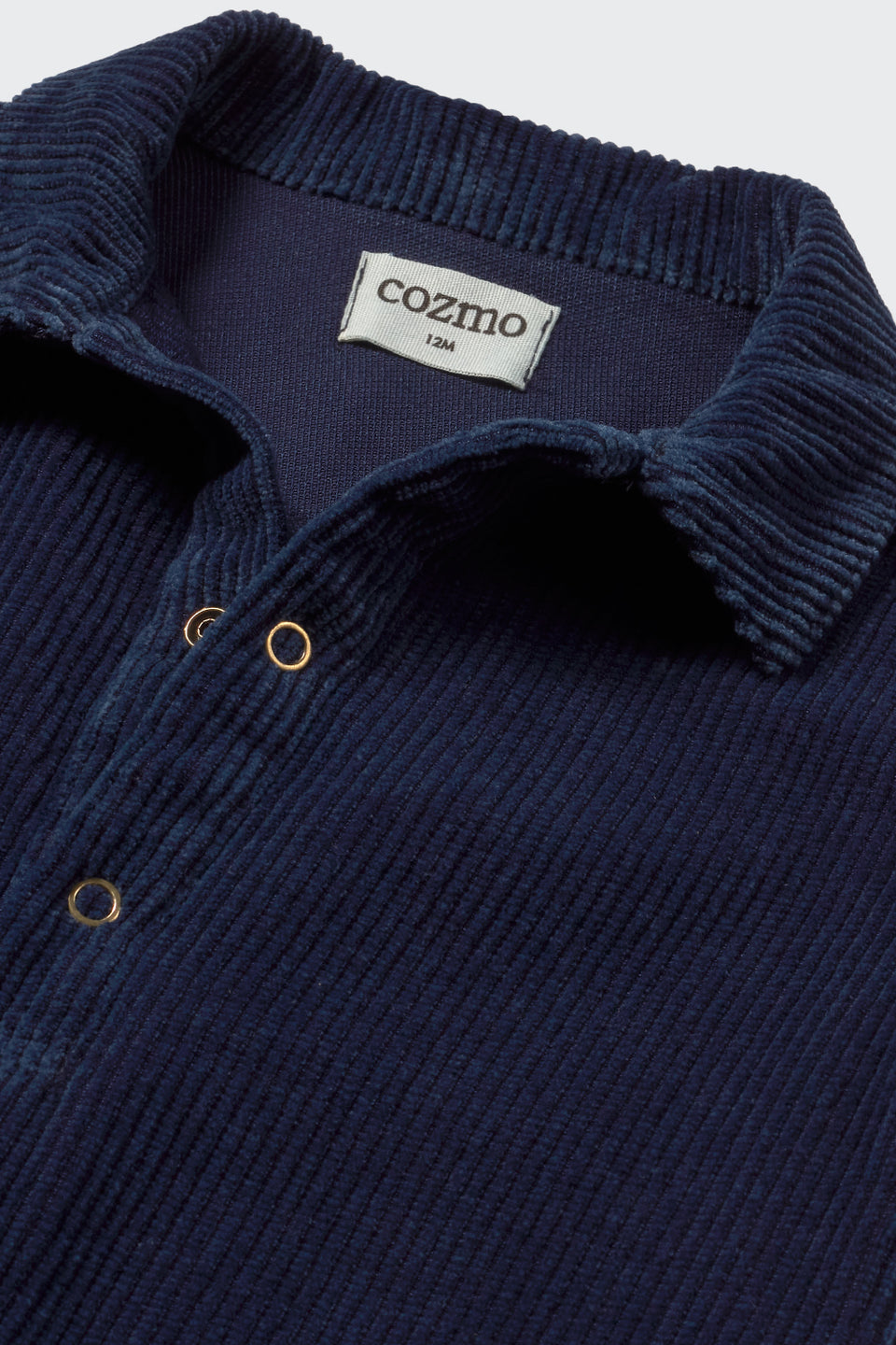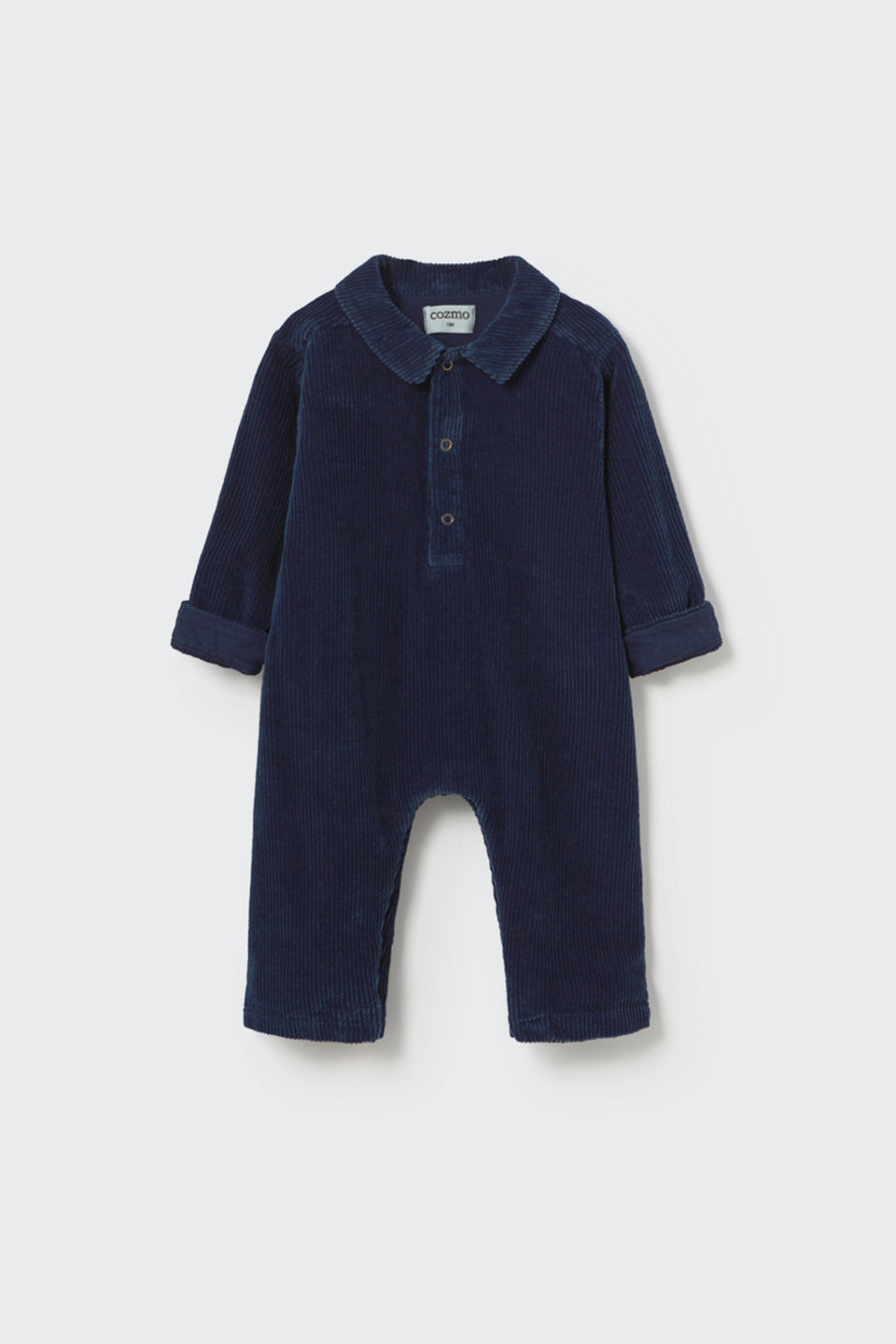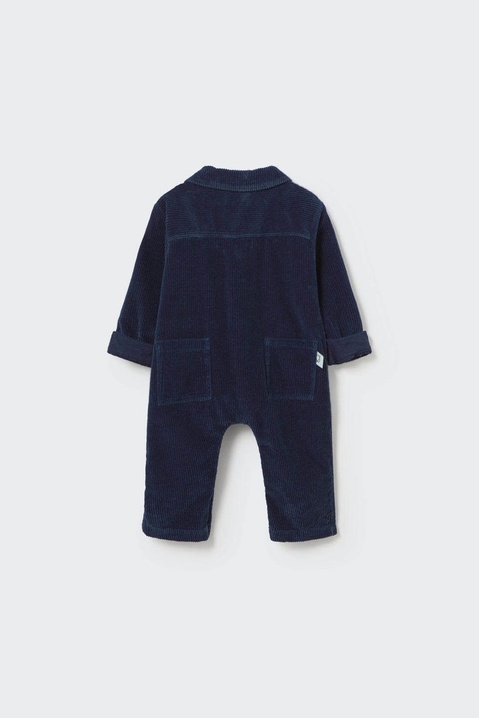 This jumpsuit for babies is made from ultra-soft wide-wale corduroy denim, offering the cozy texture of corduroy with the durability of denim. Crafted from 100% recycled cotton, it features a classic collar with a front button placket and slightly forward shoulder seams for a relaxed fit. Long sleeves with rolled-up cuffs and snap buttons along the legs ensure easy dressing and changing. Designed with a back yoke and patch pockets at the back, this piece is a practical, sustainable essential for everyday wear.