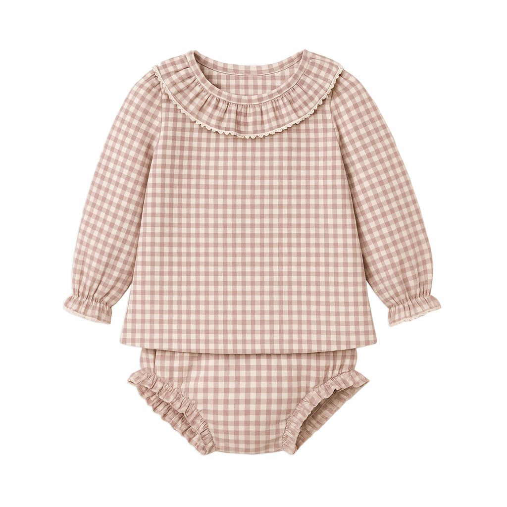 Product images shown are digital renderings. Final colors, textures, or details may vary slightly. Vintage-inspired and made for sweet days ahead, the Dorothy Set combines timeless details with all-day comfort. The ruffle-collar shirt features scalloped lace trim, gathered raglan sleeves, and a wood button closure. Paired with a matching bloomer featuring ruffled elastic leg openings, this set is picture-perfect for any season.