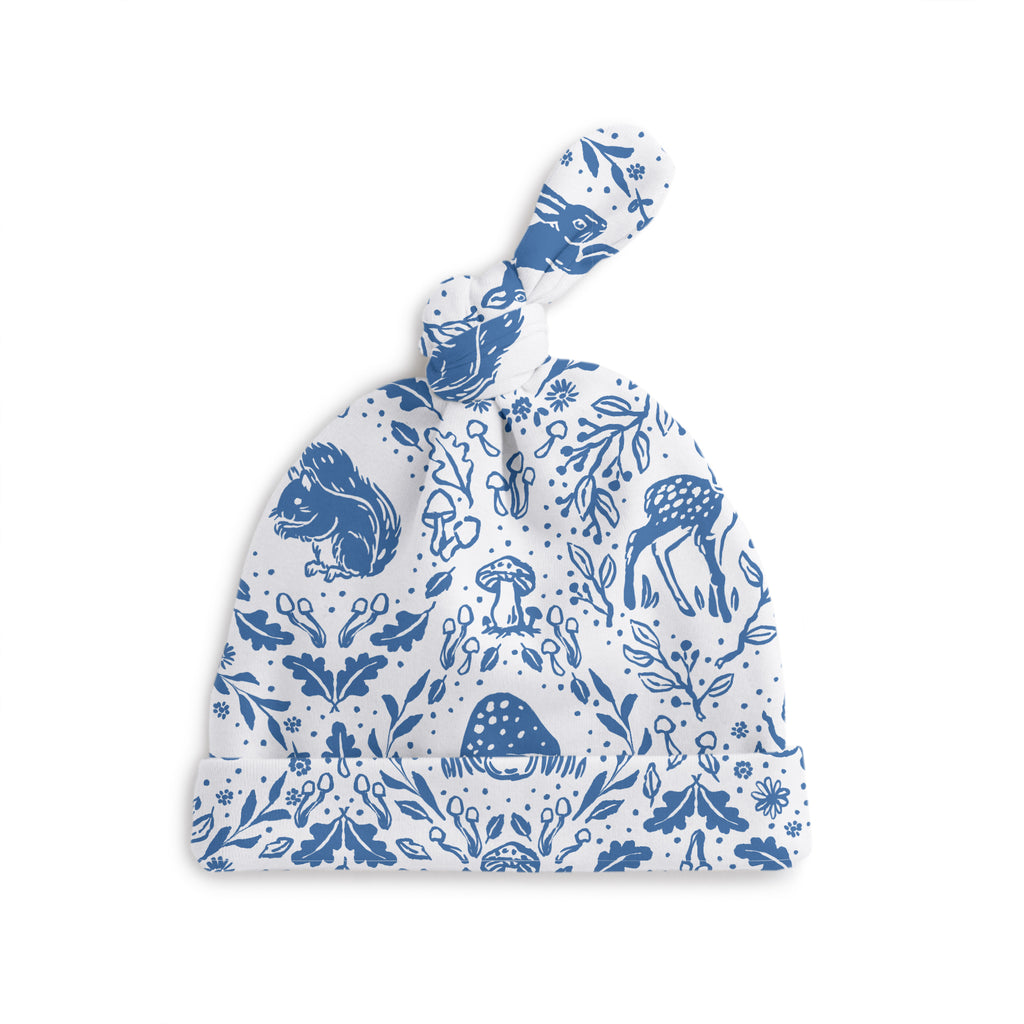 The softest and sweetest knotted hat - a must-have for any new baby - with the perfect amount of stretch for going easily over tiny noggins, in our Animal Tapestry print. Foxes, deer, birds, and other woodland friends nestled among mushrooms and leaves.