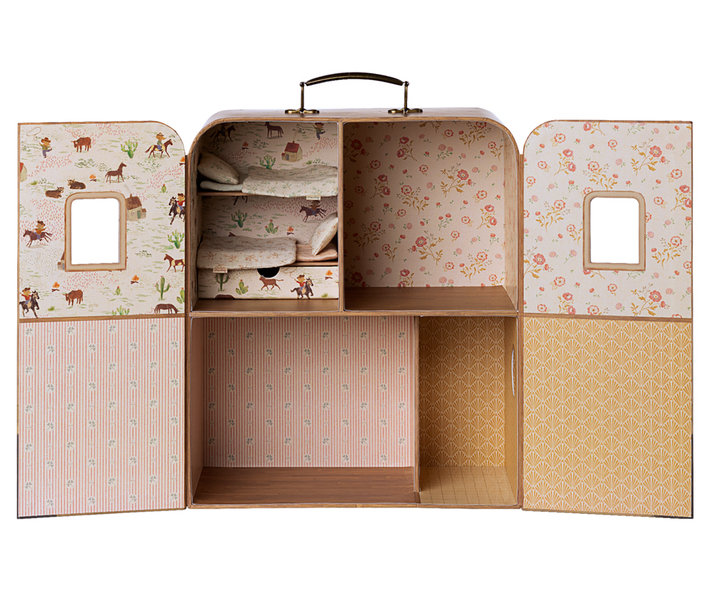 Welcome to SuitCasa - a small portable house. It fits the size: Littlebrother and sister mice. 2 sets of soft bedding for your friends are included but you can buy several of other small furnitures to decorate the house.