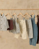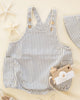 Our charming Lou Romper features shoulder straps with coconut button attachments, pockets, and bottom snaps for easy changes.