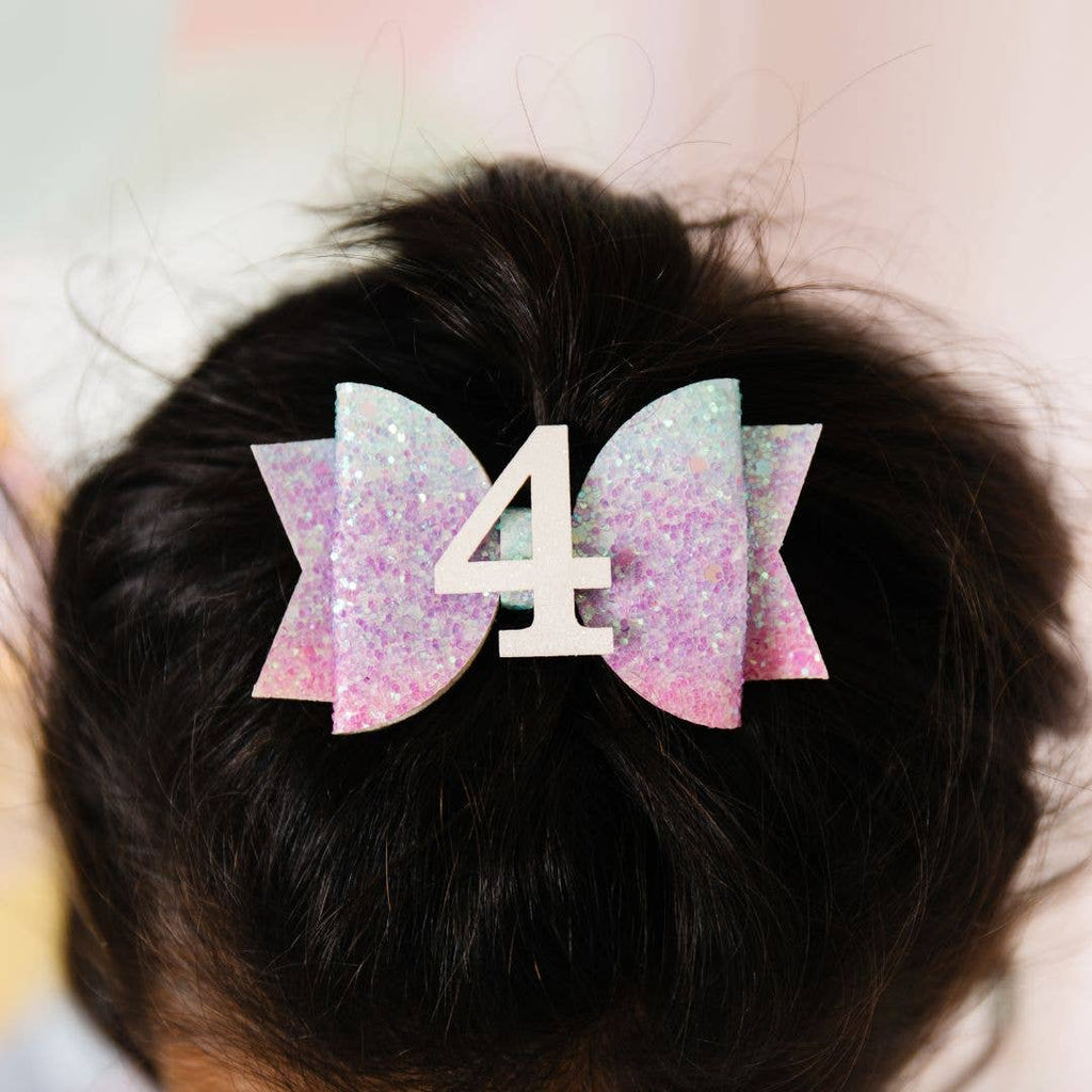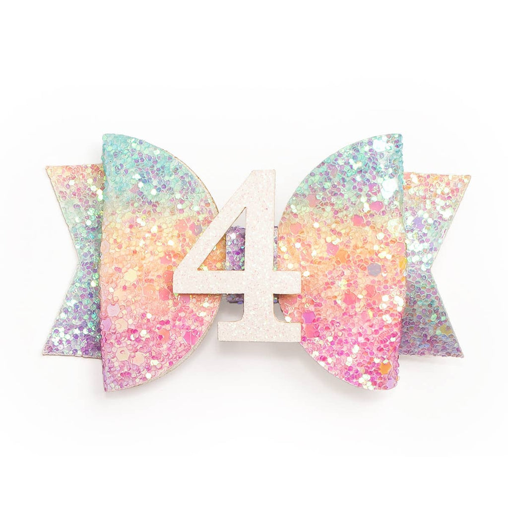Every little girl needs the perfect hair clip to complete her look! The Pastel Rainbow Bow #4 Clip is the perfect hair accessory for celebrating a 4th birthday.