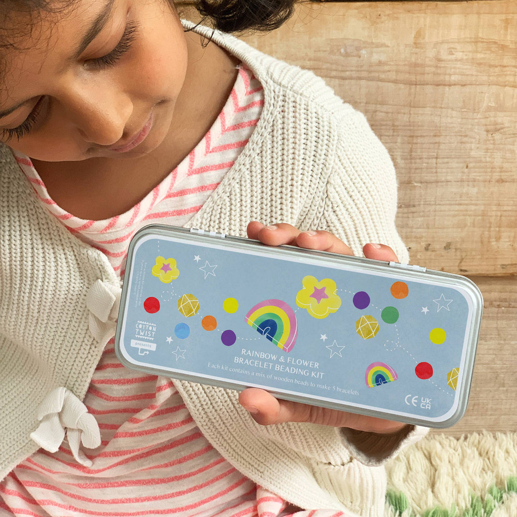 Containing enough beads to make 5 bracelets, a selection of rainbow, flower, geometric & spherical beads await. The elastic comes with metal ends to aid the beading process for young children.