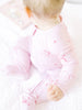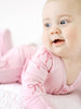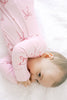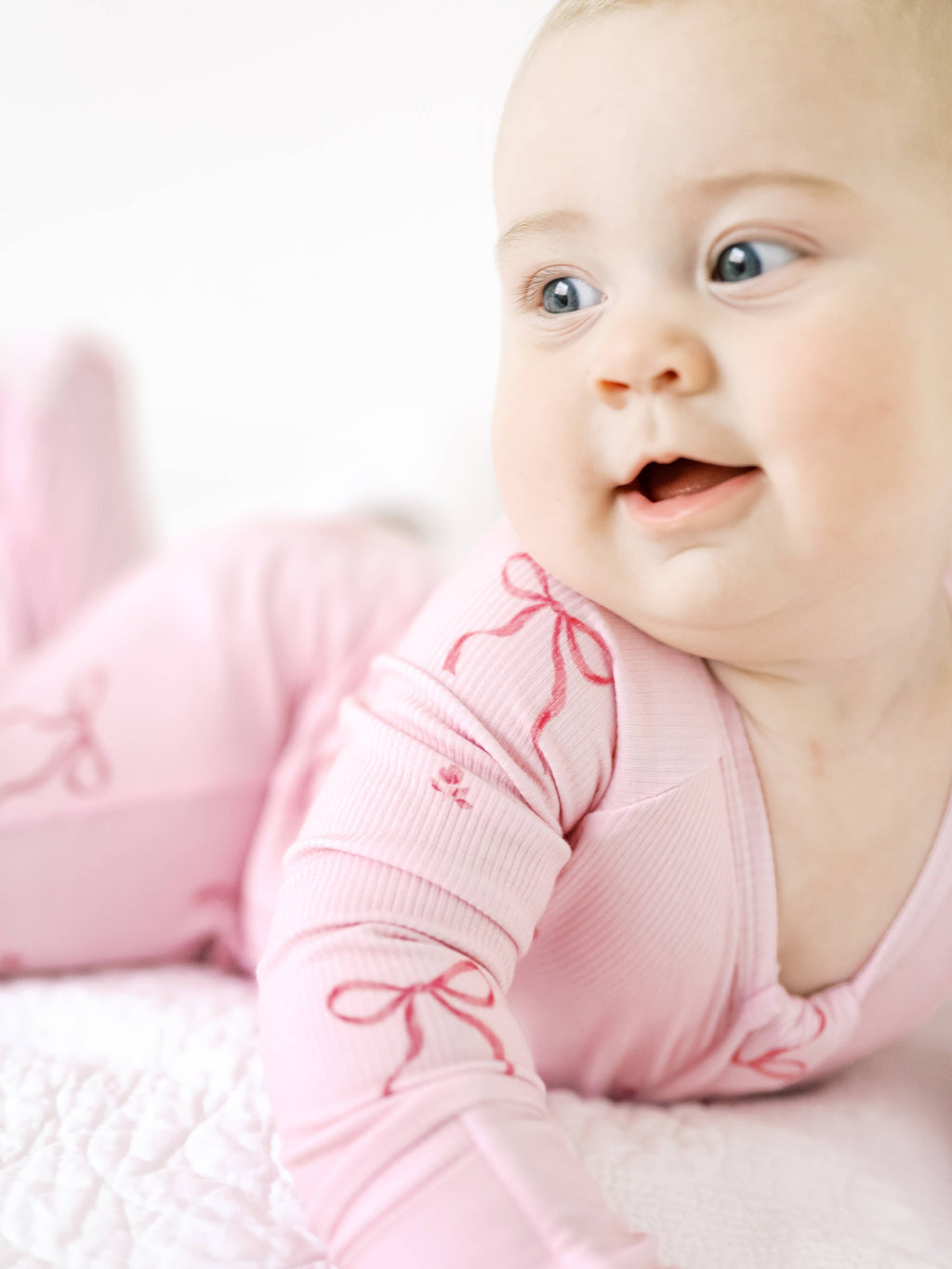 This ribbed bamboo romper with playful pink bows is soft, breathable, and perfectly comfy for your little one. Its convertible design adapts as your baby grows, making every outfit change a breeze. Crafted from untreated bamboo, it’s gentle on sensitive skin. Fits true to size. For best care, wash gently cold inside out with zipper closed and tumble dry low or hang dry.