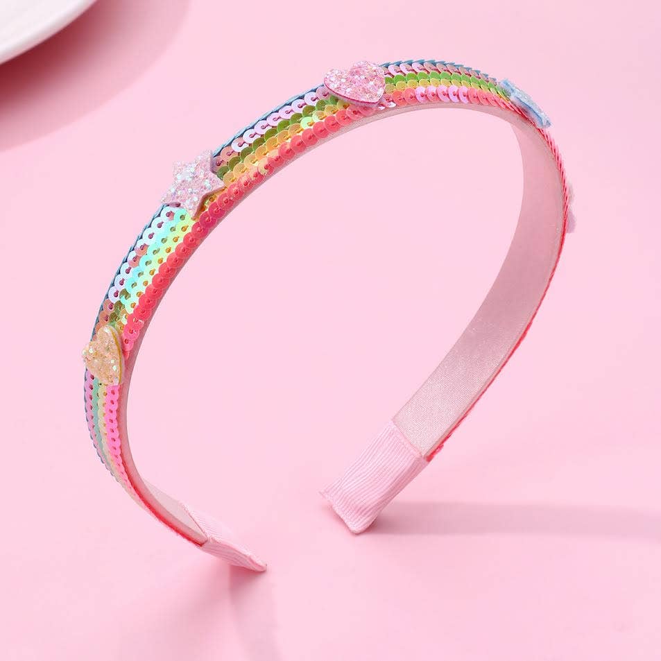 Complete your look with our Sequin Headband in Rainbow Run. This colorful headband is the perfect finishing touch with its sparkling sequins and cute heart and star accents. Get ready to run in style and shine like a star with this playful accessory!
