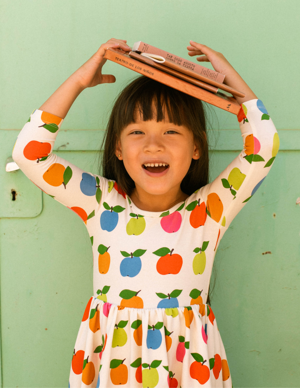 dress is made with stretchy-soft organic cotton and features a scooped back, pockets for all their treasures, and a full circle skirt made for twirling.