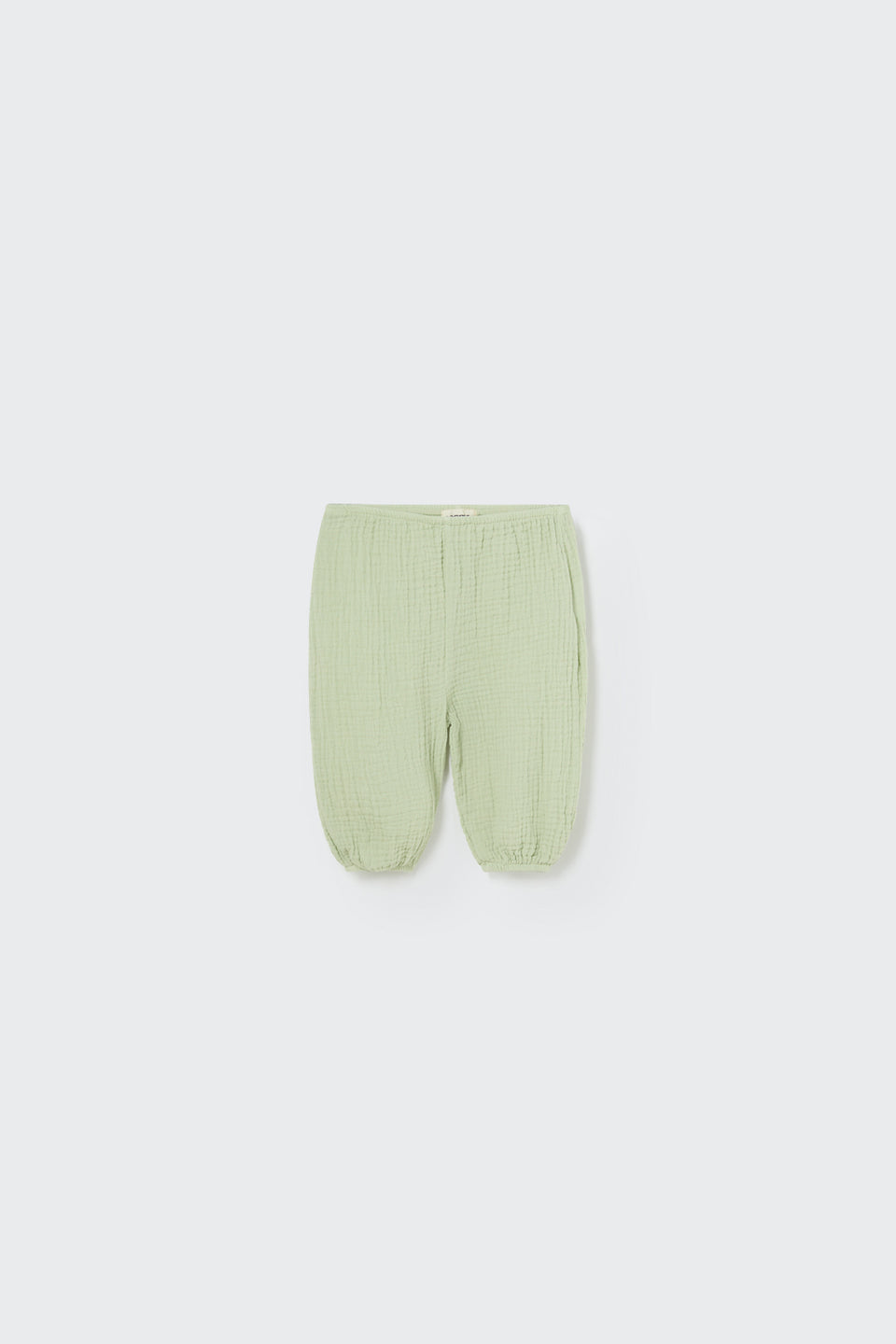 Pants in fluffy, light cotton gauze. Elasticized waistband with decorative drawstring. Elastic cuffs. Naturally wrinkled texture.