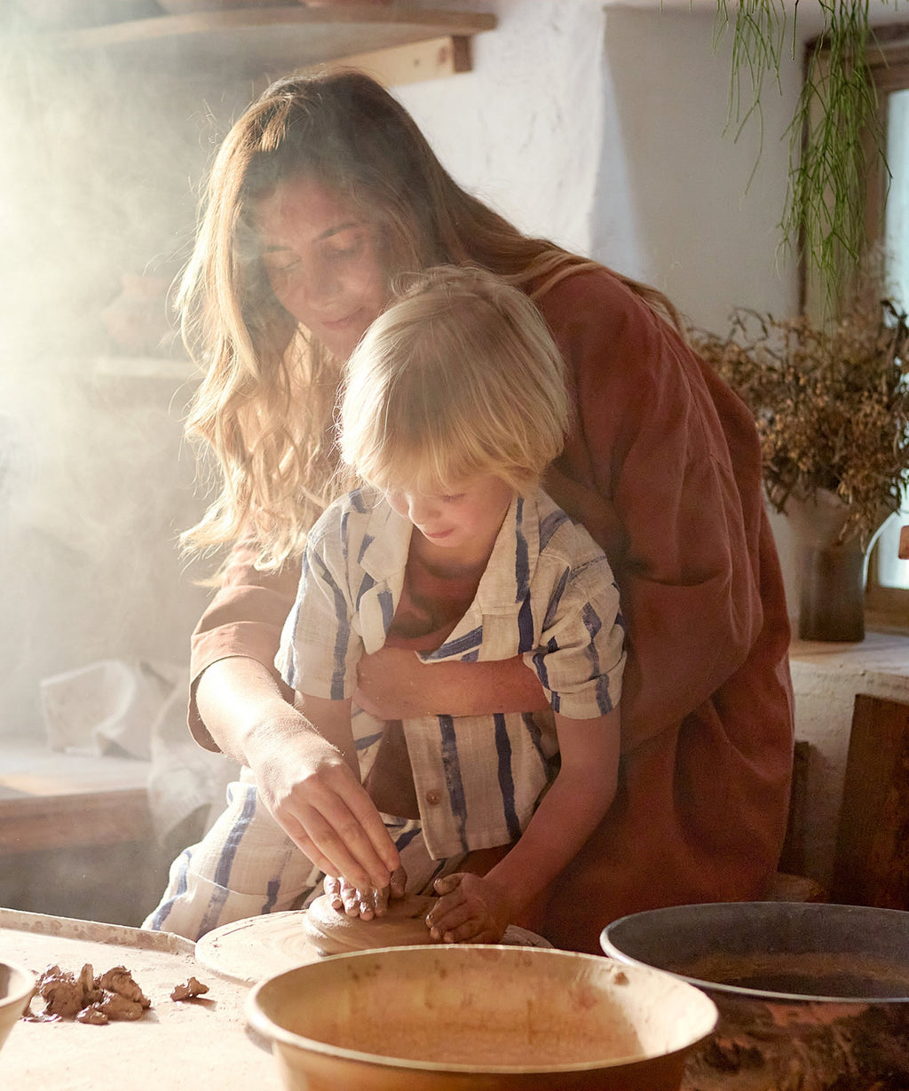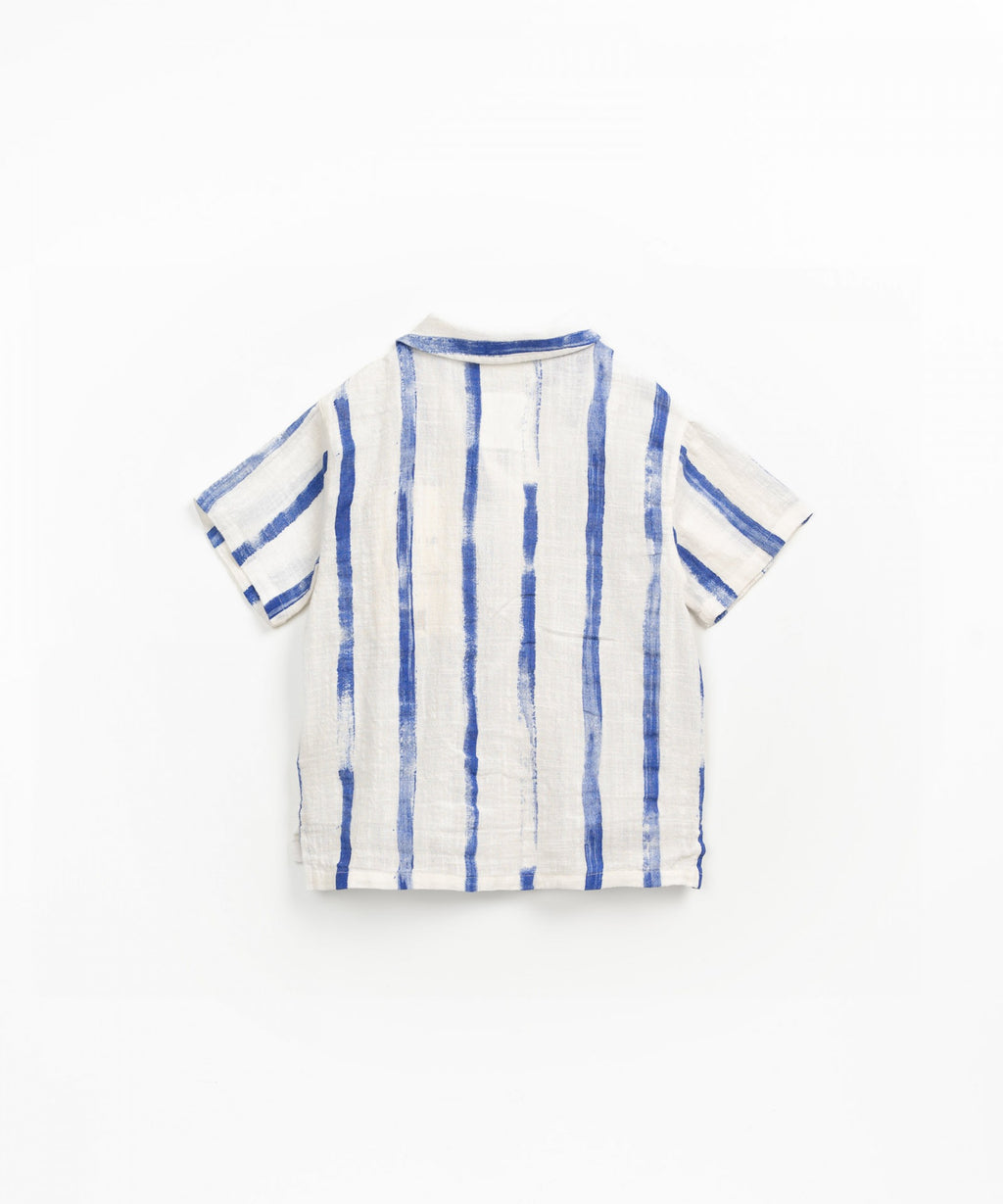 This shirt is made of organic cotton fabric, in the color Grés Risca Telo. It is a short-sleeved model with vertical stripes, featuring a collar and a front opening with coconut buttons.