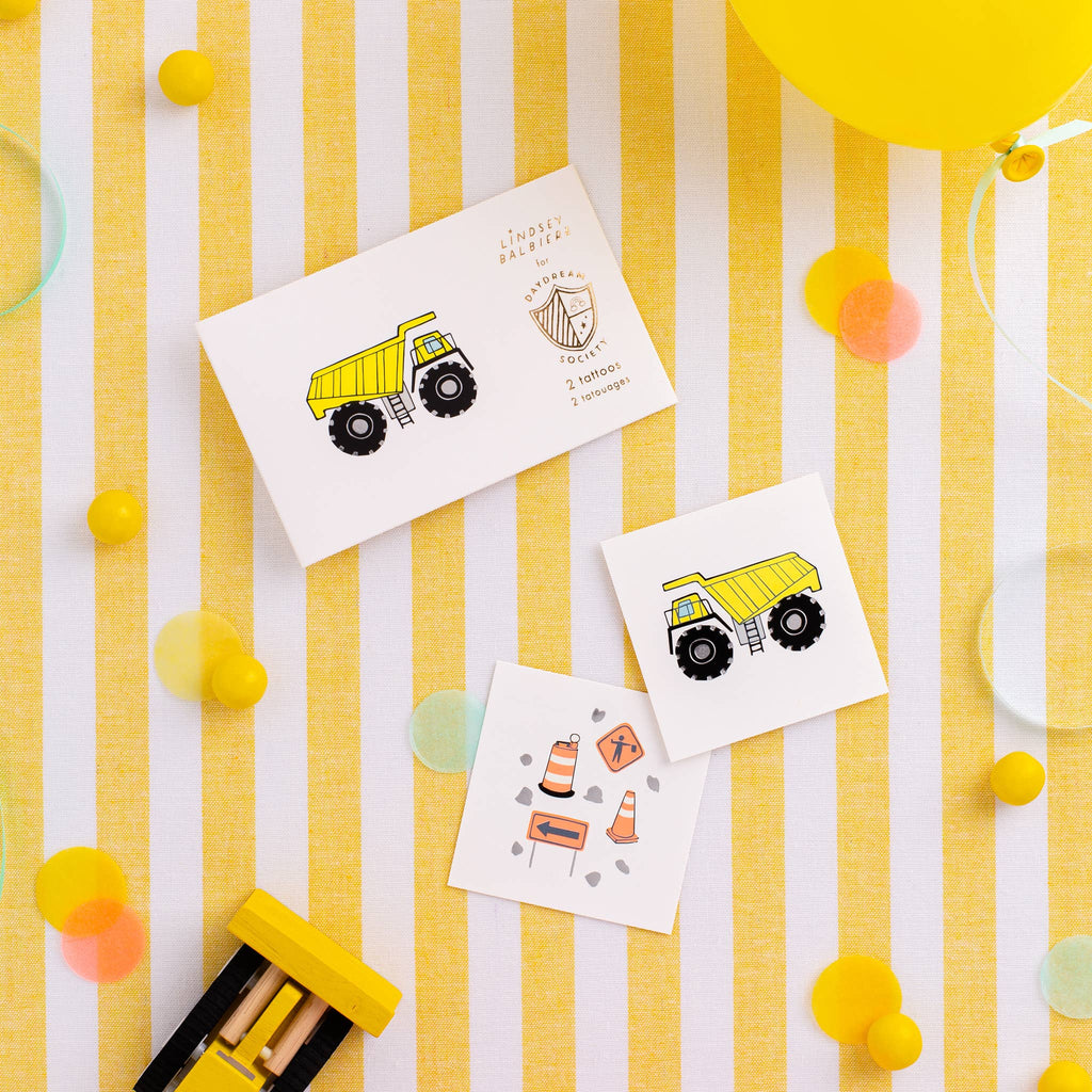 Caution...you're now entering a party zone! Featuring bold colors and silver foil elements, we're seriously digging these construction tattoos!