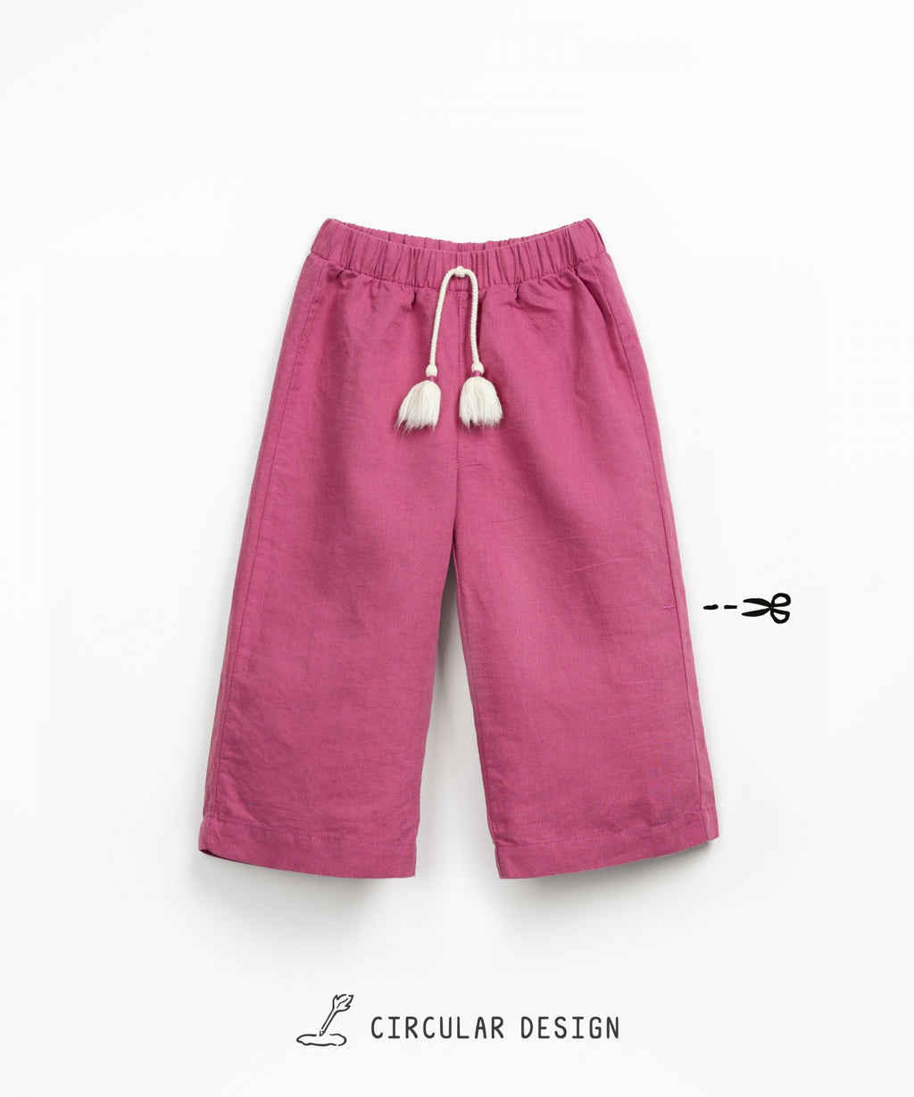 These trousers are made of linen and organic cotton fabric, in the Stories color. They are a wide palazzo model with an elastic waistband and an adjustable cord with decorative pom-poms, finishing with slightly tapered legs.