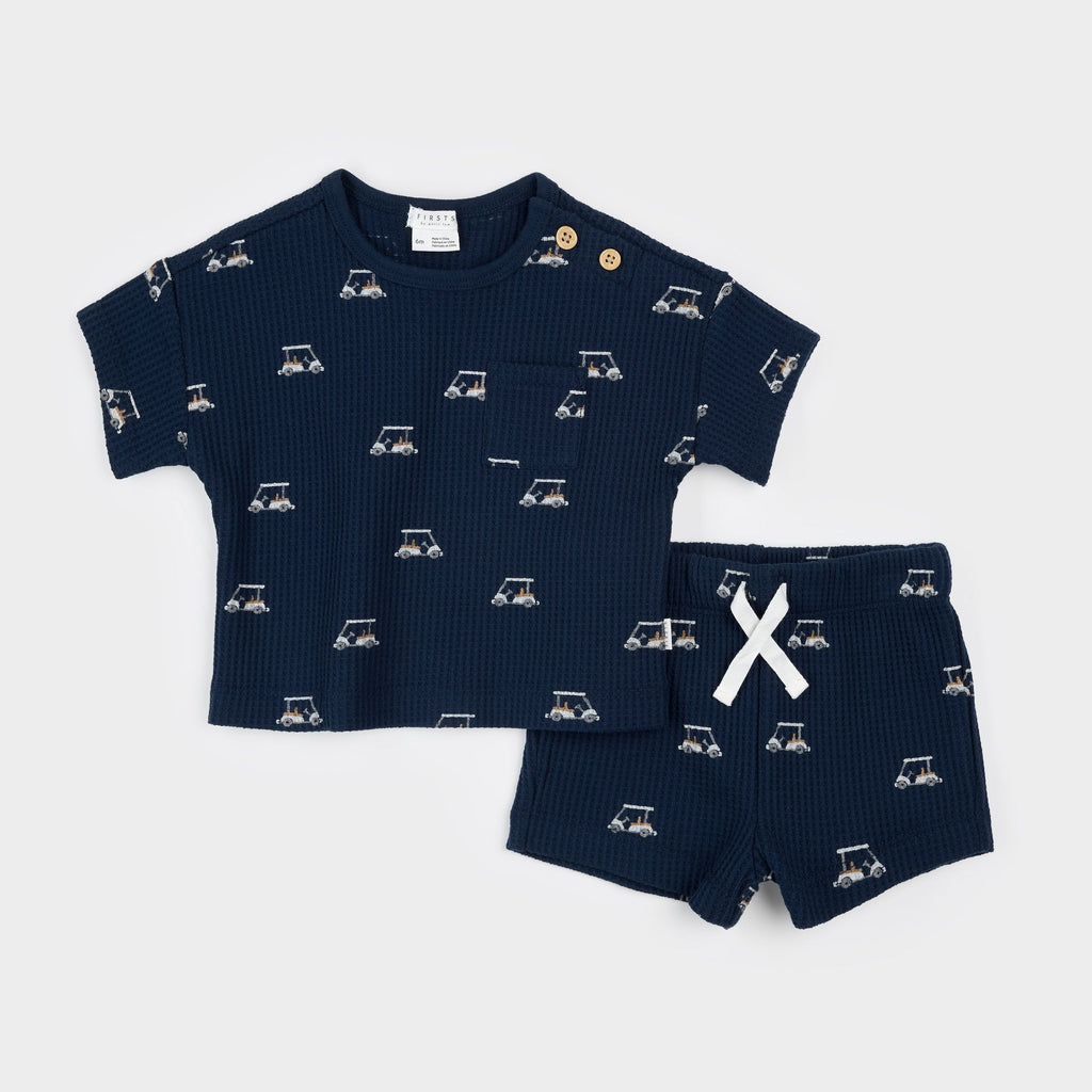 Made for everyday exploring, this navy outfit set includes a short-sleeved tee and matching shorts, both donned with our Small Golf Carts print. Perfect for dropping dad off at the club and heading out on their own little adventure, the 2-piece set keeps him cool and comfortable through the warm weather. The short-sleeved top has a double button placket along the neckline to make dressing that little bit easier and the shorts have a gently elasticated waistband. Made from organically grown cotton thermal, the set is perfect for exploring new terrains.