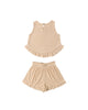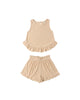 This terry cloth set features a scoop neck tank with bottom ruffle detail and matching shorts with an elastic waistband and a wide leg fit for a relaxed and breezy look.