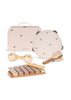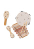 Set of high gloss music instruments, including tambourine, castanet, maracas and xylophone with drumsticks. The instruments come in a little suitcase.